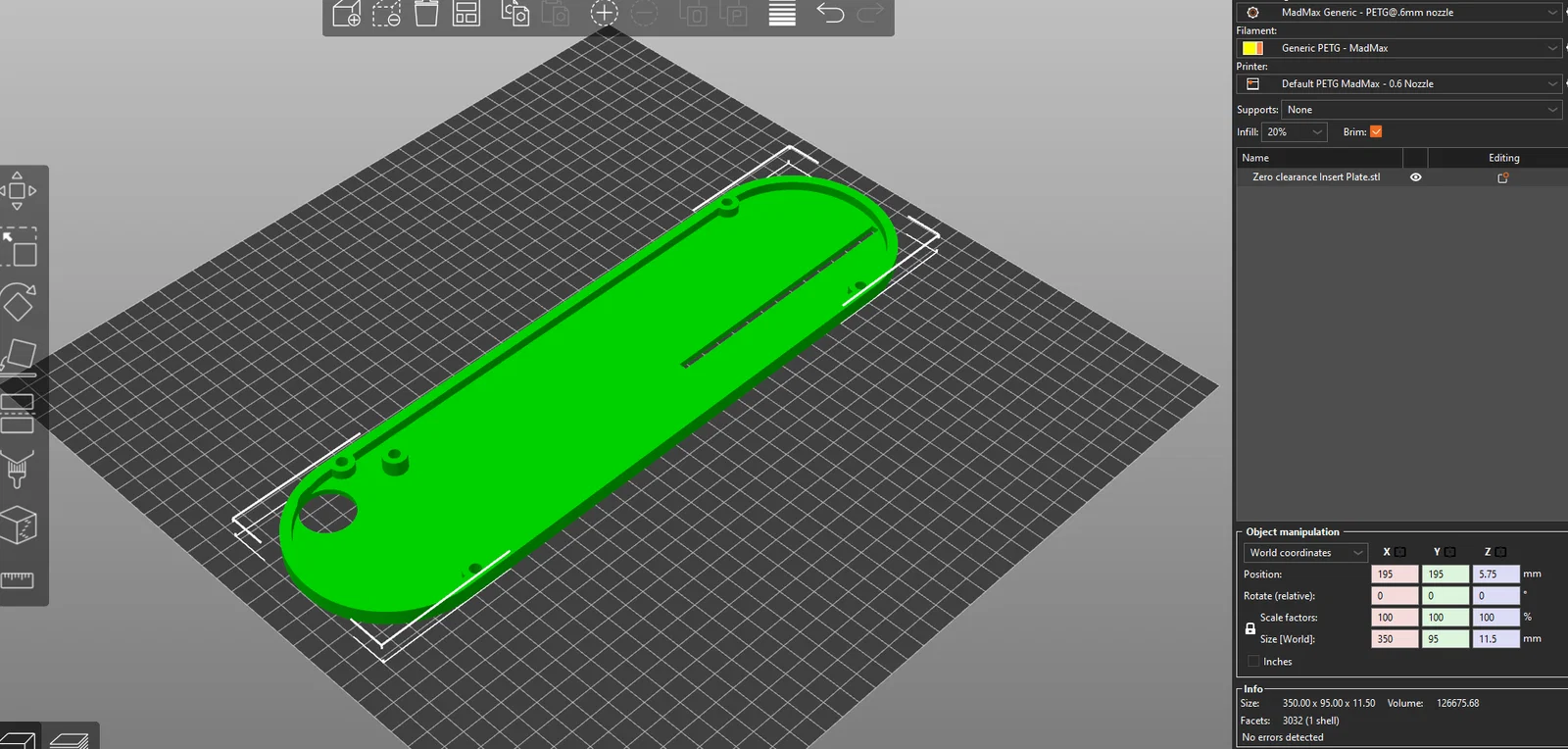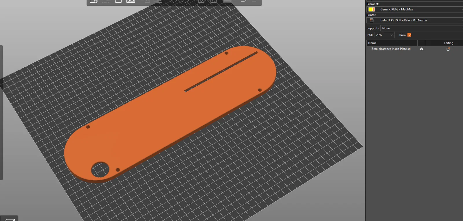 File 3mf được thiết kế trên Prusa Slicer, bao gồm một modifier thiết lập infill 100% tại vị trí lưỡi cưa sẽ cắt qua khi bạn nâng lưỡi lên. Bạn có thể sử dụng file này hoặc áp dụng ý tưởng đó để đặt infill thấp cho phần còn lại của tấm chèn, nhằm tiết kiệm nhựa nhưng vẫn đảm bảo độ cứng chắc ở khu vực lưỡi cưa cắt qua.
