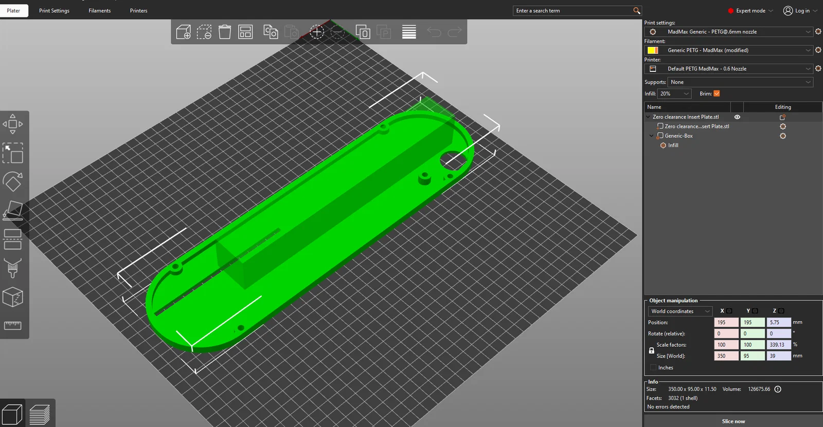 Tôi in bằng nhựa PETG trên máy in giường 400x400mm. Bạn sẽ cần bàn in có chiều dài ít nhất 350mm cho cạnh dài nhất của tấm này.