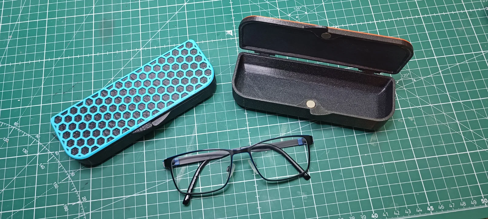 Hộp đựng kính họa tiết lục giác kèm plug lục giác gắn tùy ý. Nắp in không cần support, thân hộp cần support; có hướng dẫn dùng PETG 1.75mm làm chốt và gắn 2 nam châm 8×2mm. Kích thước trong: 25×45×144mm.