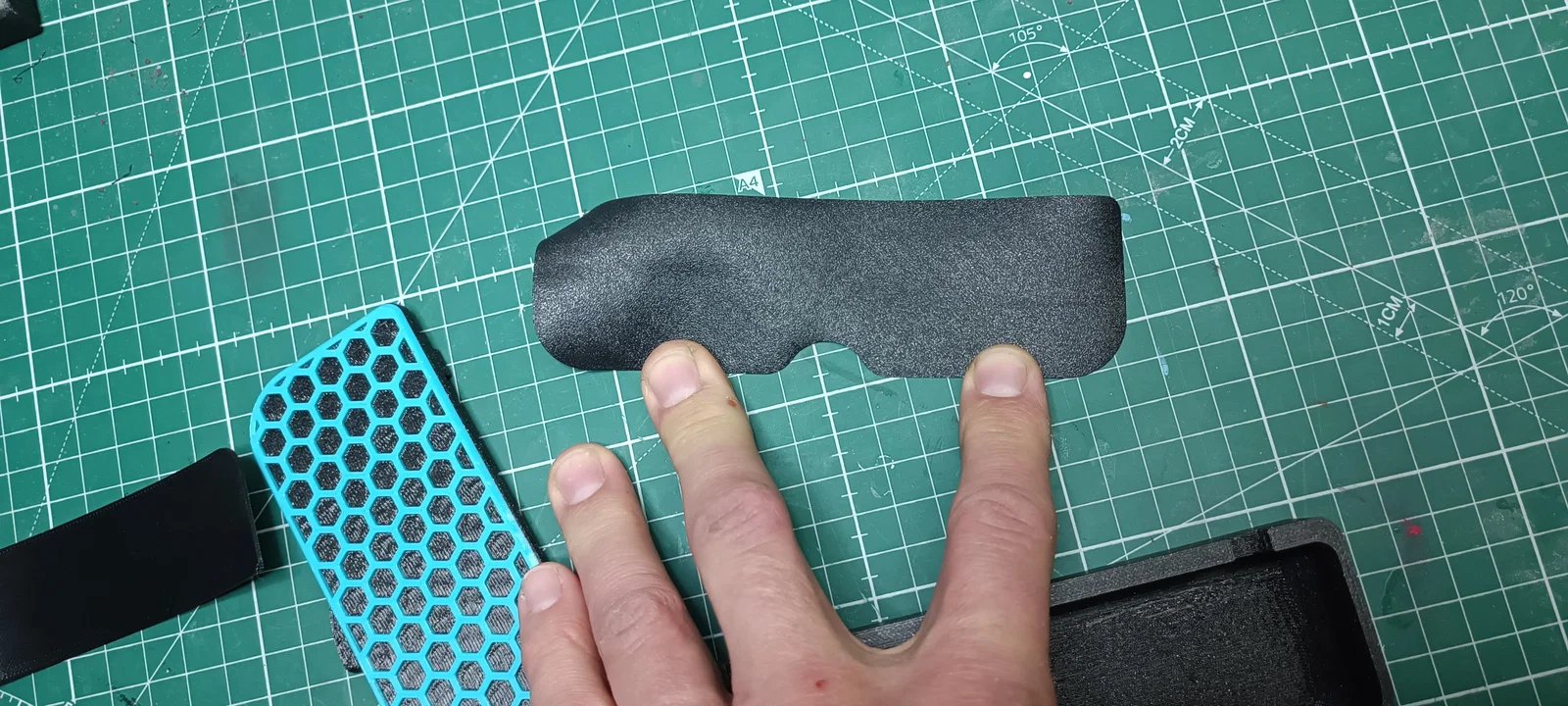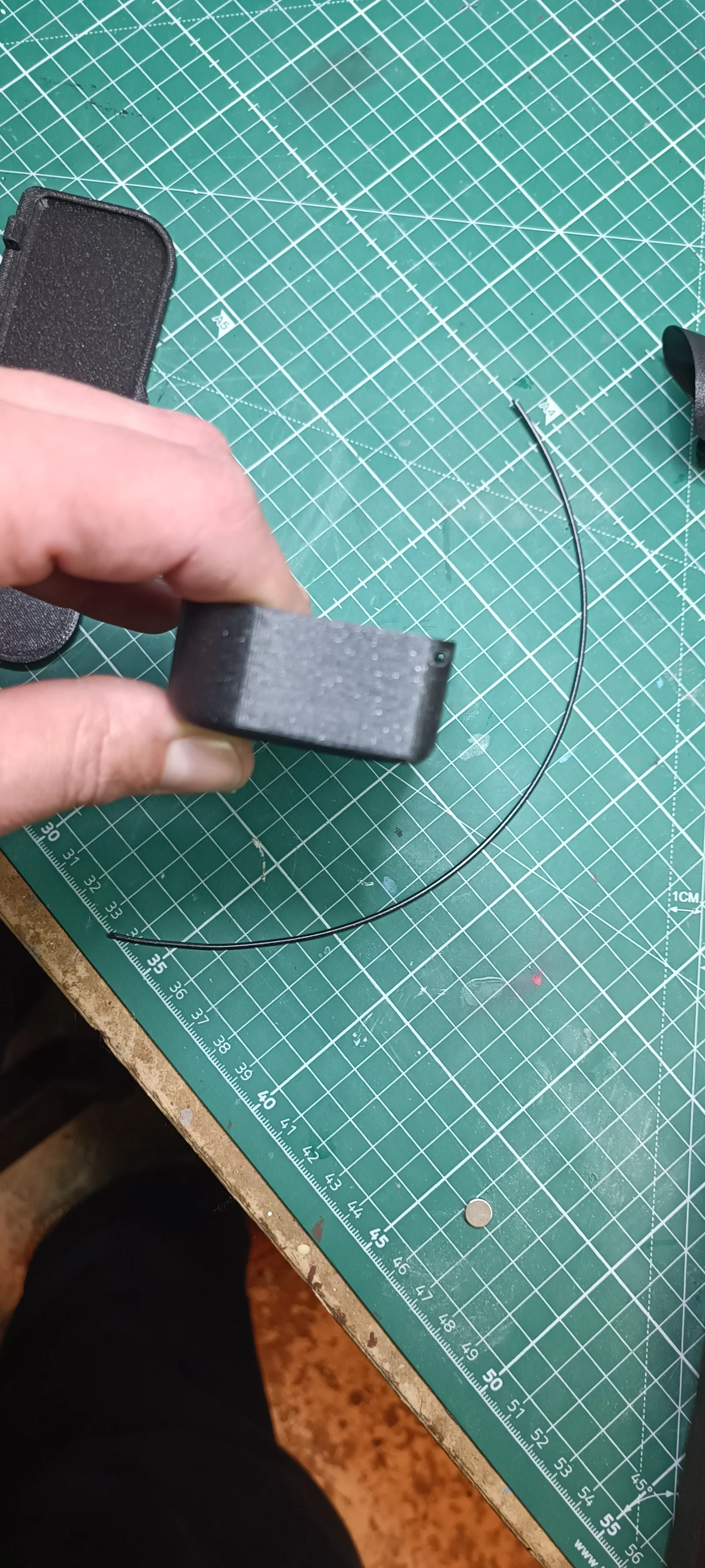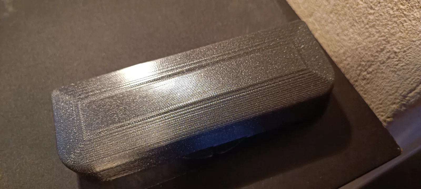 Phần nắp không cần support, còn phần hộp thì có. Mình thử in phần hộp theo “right side” (đáy hướng xuống) để giảm support, nhưng đáy in ra lại bị xấu. Có thể do mình bỏ sót cài đặt support nào đó? Sau khi mình dán phủ đáy và nắp bằng một lớp “insert” làm từ filament FilaFlex40 (mình dùng keo xịt để dán), thì bề mặt bị xấu do support cũng không sao vì sẽ được che lại. Mình dùng filament PETG 1.75mm loại thường để giữ nắp với hộp lại với nhau; luồn filament vào lỗ có thể hơi khó. Mình phải nạo/đục rộng lỗ ra chút rồi mới luồn filament vào được.