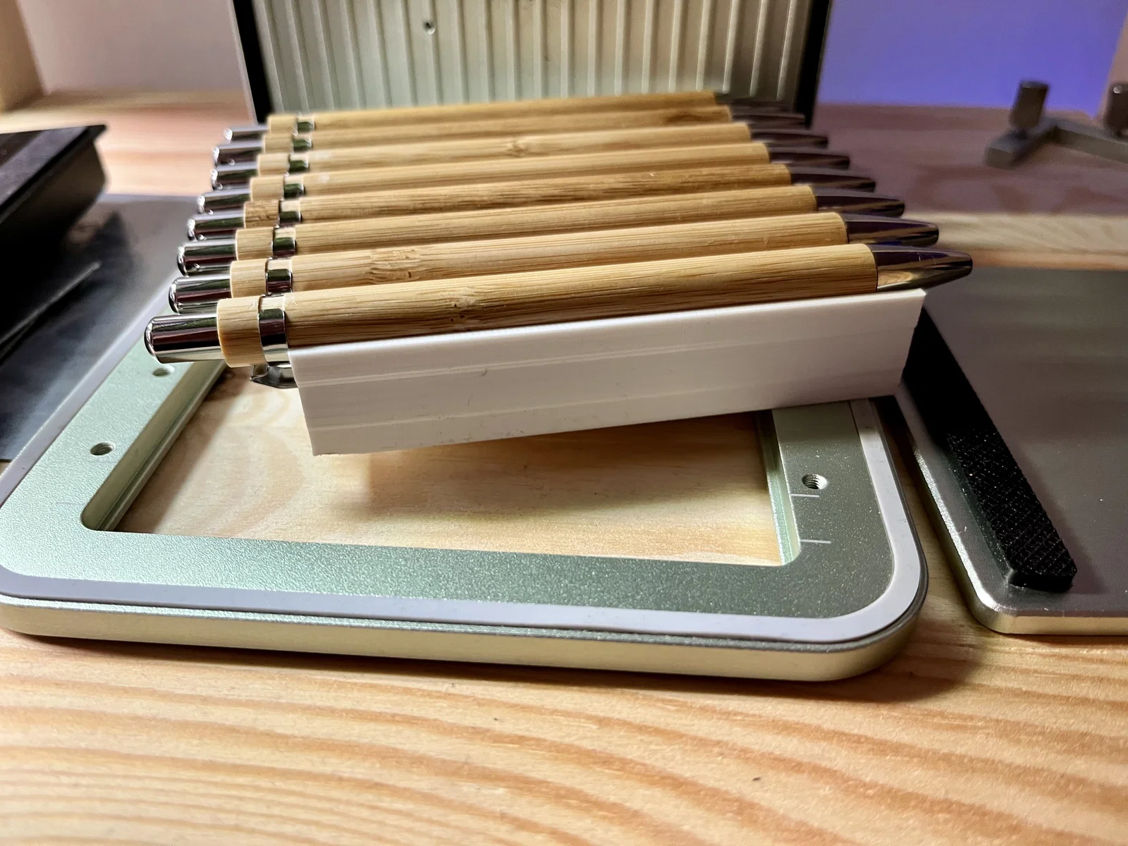 Nếu bạn đang sở hữu chiếc máy khắc laser xTool F1 và thường xuyên phải khắc logo lên bút viết, đây chính là phụ kiện không thể thiếu trong xưởng của bạn. Khay cố định này được thiết kế chuyên biệt để giúp việc khắc đồng loạt 8 cây bút trở nên nhanh chóng, chính xác và đồng nhất hơn bao giờ hết. Thay vì phải căn chỉnh từng cây bút một cách thủ công gây mất thời gian và dễ sai lệch, bạn chỉ cần đặt chúng vào các rãnh của khay là có thể bắt đầu khắc ngay lập tức.