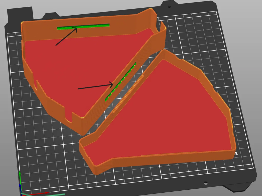 Dùng tính năng “paint on support enforcers” cho các khe kẹp (clip openings) trên phần đế (base component) – xem hình trong slicer.