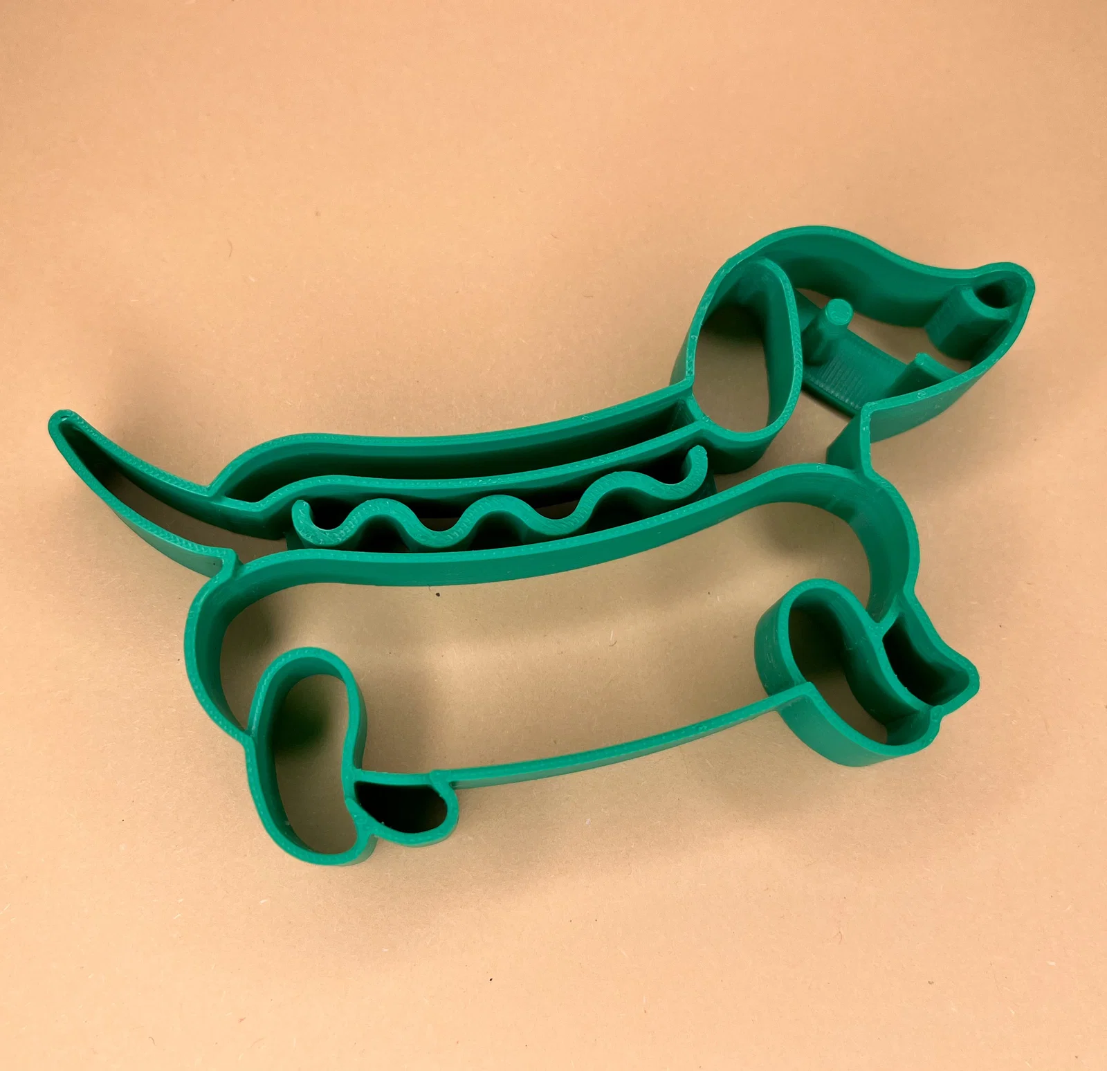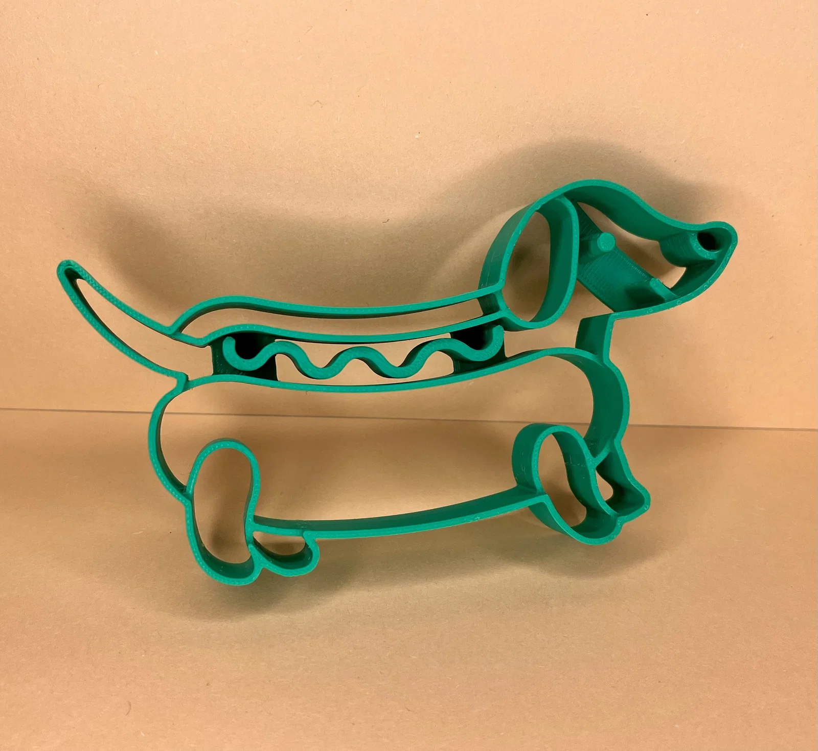 Làm mấy buổi làm bánh thêm vui với mẫu khuôn cắt bánh cookie in 3D siêu “lầy” này: một chú chó lạp xưởng (wiener dog) nằm gọn trong ổ bánh mì, phía trên còn có đường mù tạt ngoằn ngoèo. Thiết kế vừa hài hước vừa dễ thương, rất hợp để làm cookie, fondant hoặc đồ thủ công—bảo đảm “được lòng” người mê chó và mê đồ ăn!
