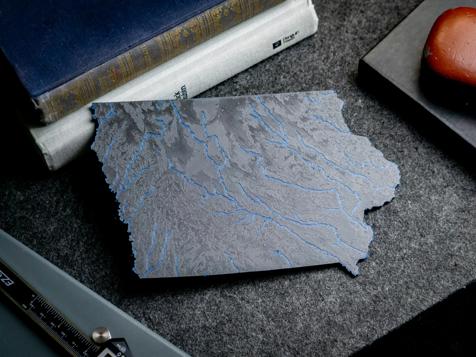 Bản đồ địa hình nổi Iowa, USA (IA) in 1 hoặc 2 màu, có sông suối và hồ. File 3MF đã tách phần đất/nước để in dual extrusion dễ canh. Có thể scale theo máy, phù hợp trưng bày hoặc làm quà.