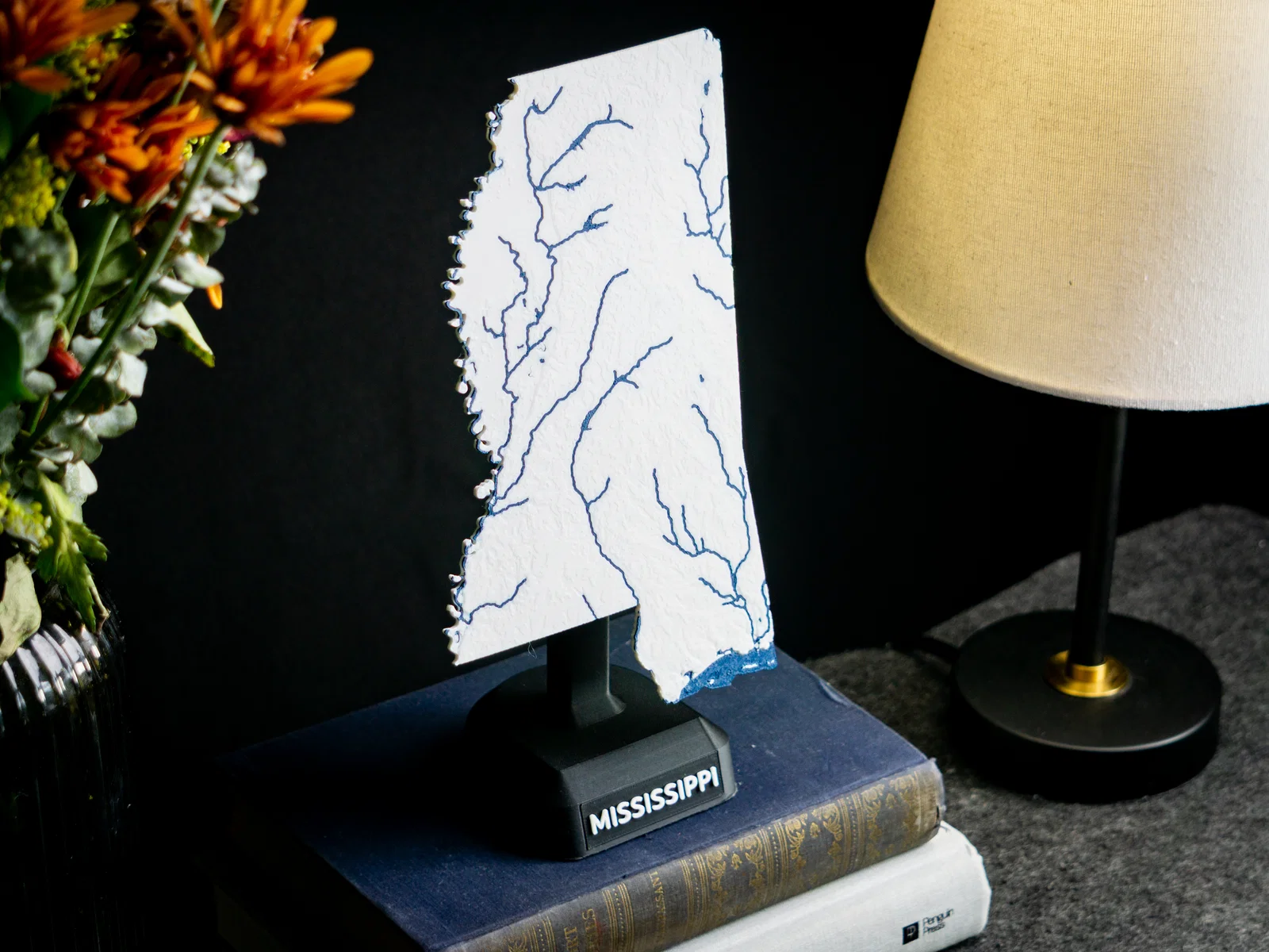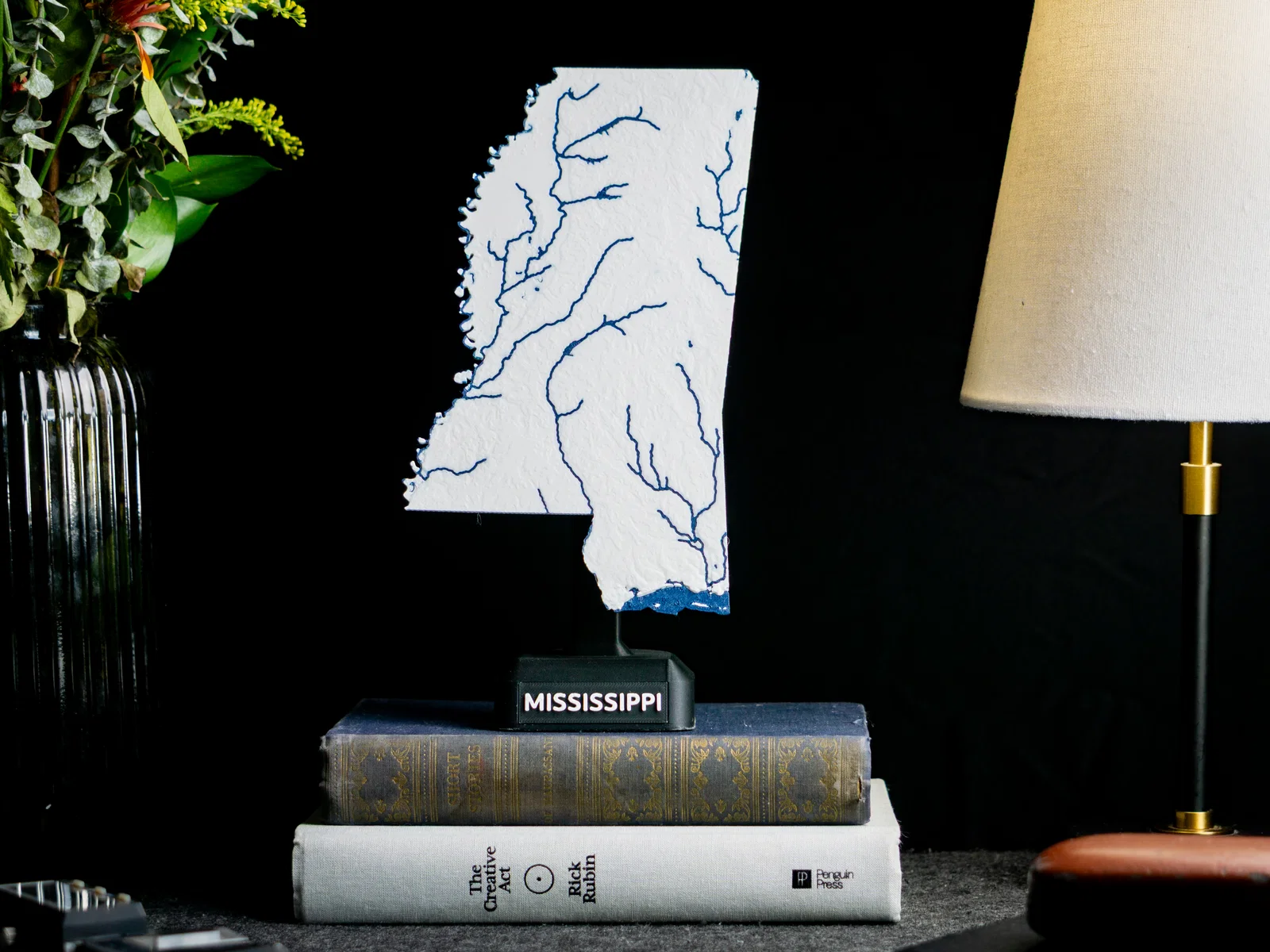 Bản đồ địa hình nổi Mississippi (MS), USA dạng 1 màu hoặc 2 màu, có sông suối, hồ và đường bờ biển. File 3MF tối ưu cho in dual extrusion, có thể scale theo kích thước máy in và ghép với bộ USA of Plastic.