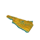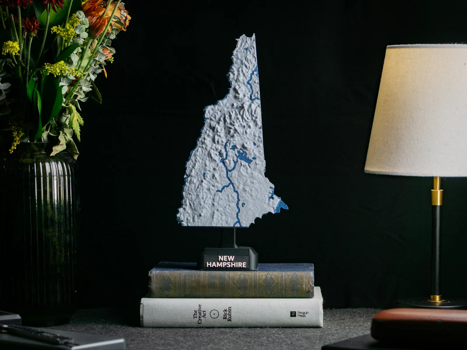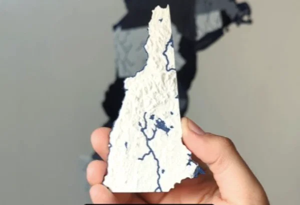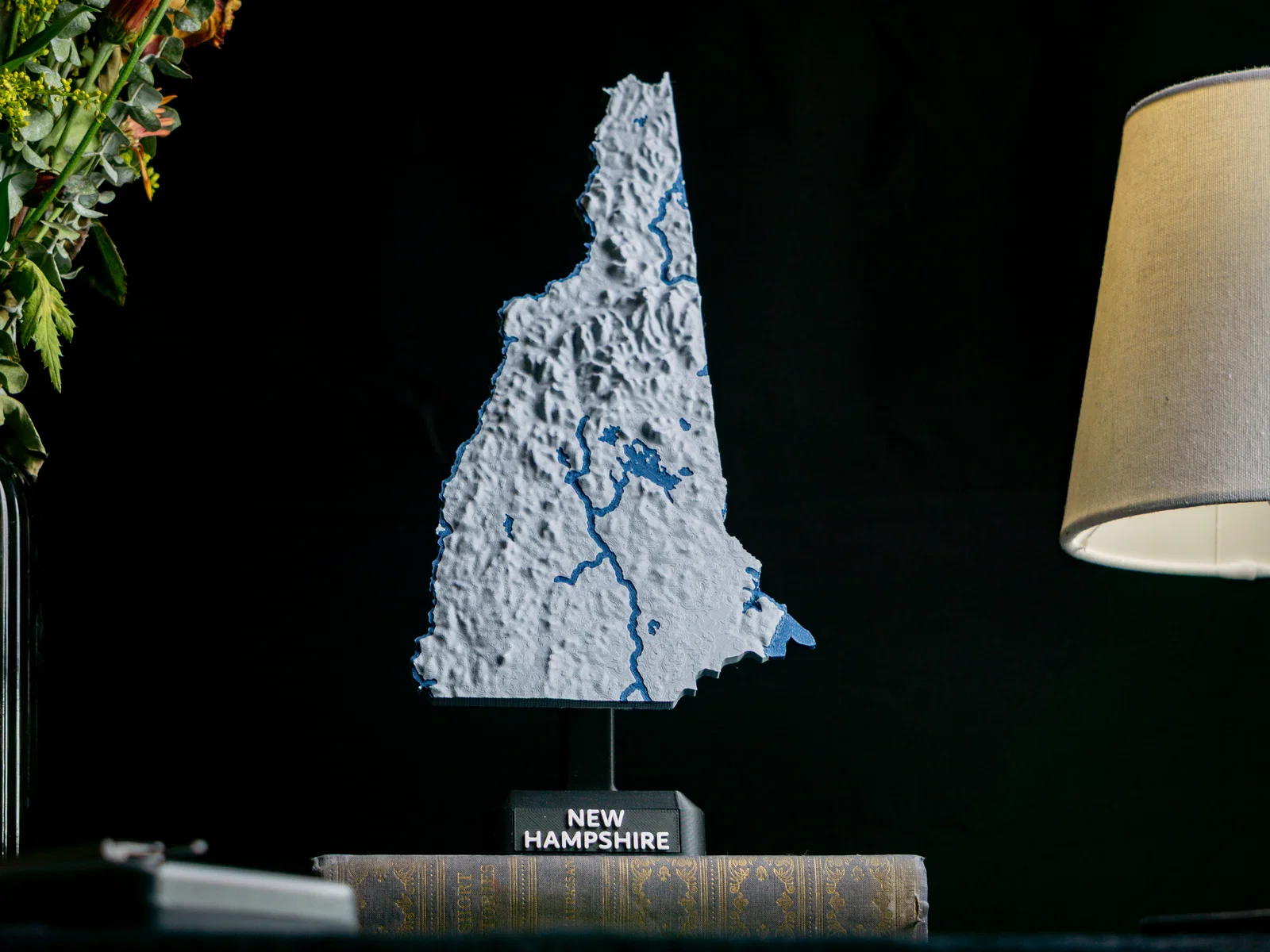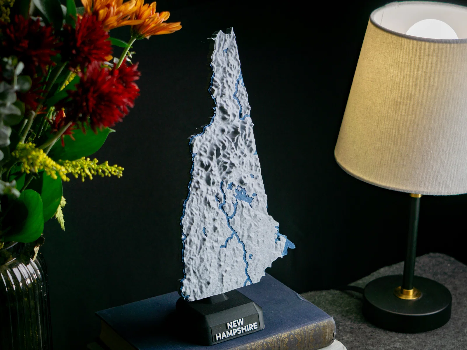 Bản đồ địa hình nổi New Hampshire (NH), USA dạng in 1 màu hoặc 2 màu, có đầy đủ núi, sông suối, hồ và đường bờ biển. File 3MF tối ưu cho in dual color, ghép khớp theo bộ USA of Plastic.
