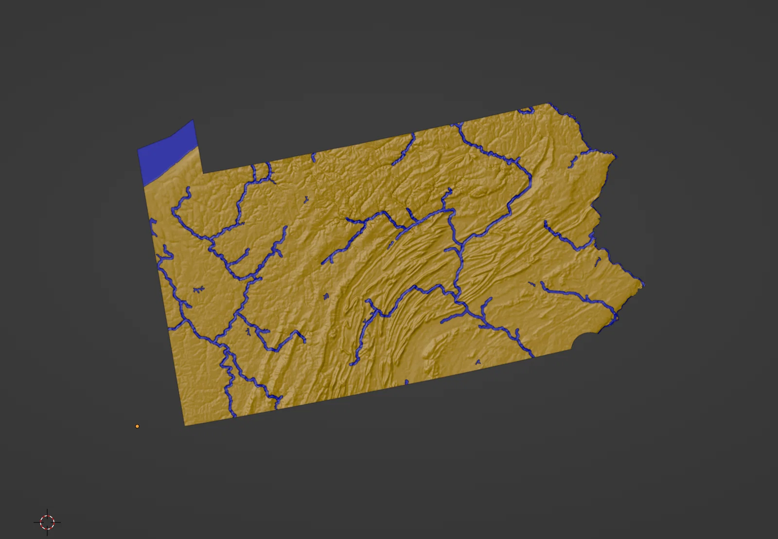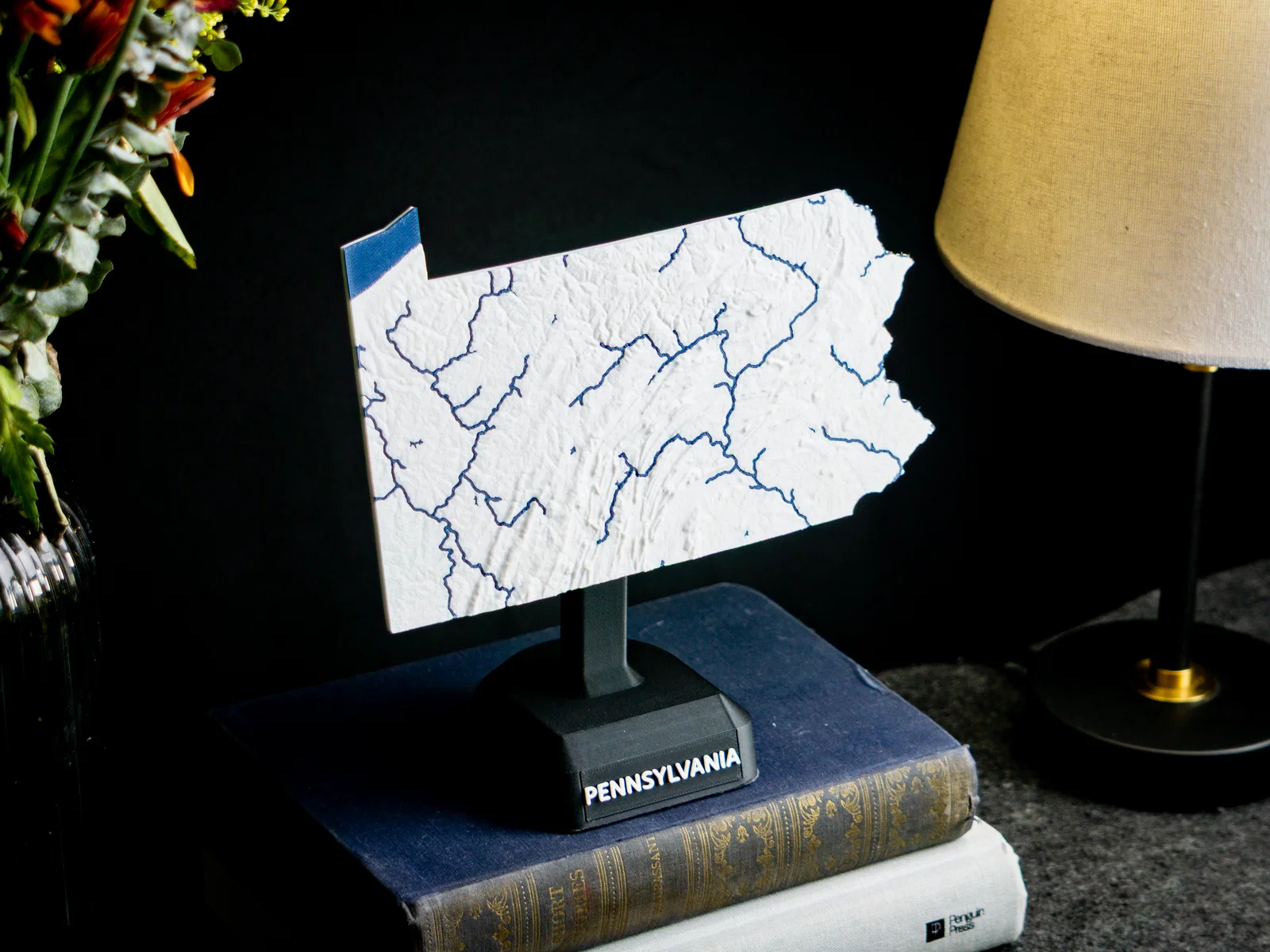 Bản đồ địa hình nổi Pennsylvania (PA), USA dạng 3D in 1 hoặc 2 màu, có núi, sông suối và hồ. File 3MF tối ưu cho dual extrusion, ghép được như puzzle trong bộ sưu tập USA of Plastic.