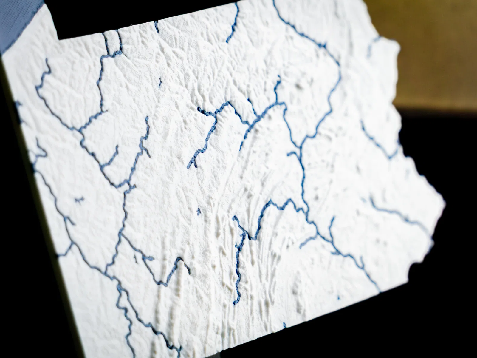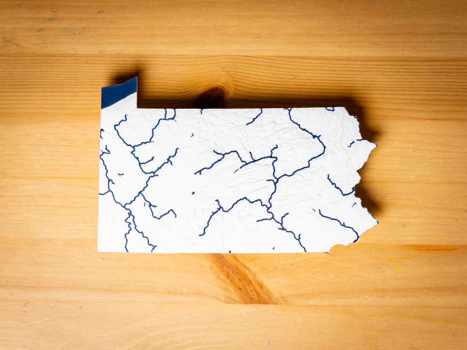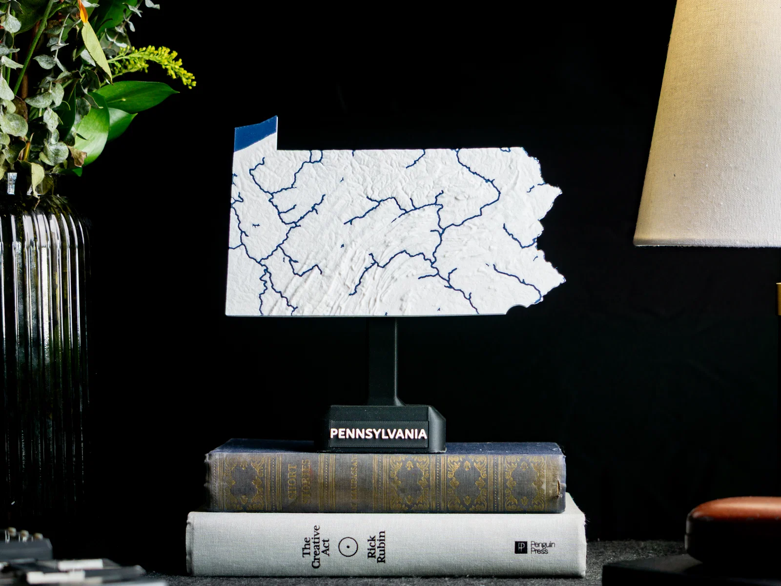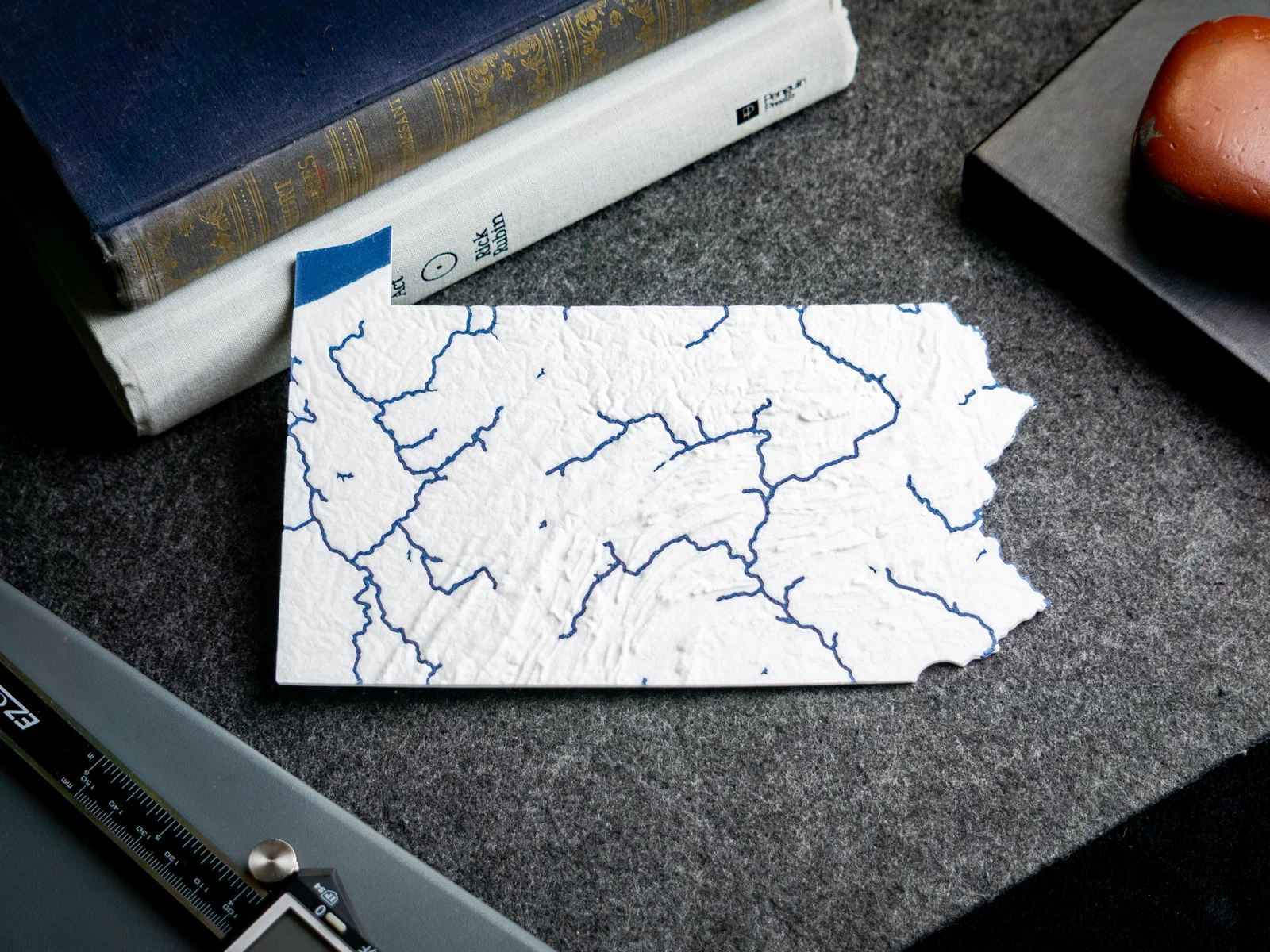 Bản đồ địa hình & thủy văn Pennsylvania, USA với núi, đường bờ, suối, sông và hồ—có thể in 2 màu hoặc 1 màu! Tất cả các bang trong bộ sưu tập USA of Plastic đều ở tỉ lệ 1:2500000 và có thể ghép khớp với nhau như miếng ghép puzzle.