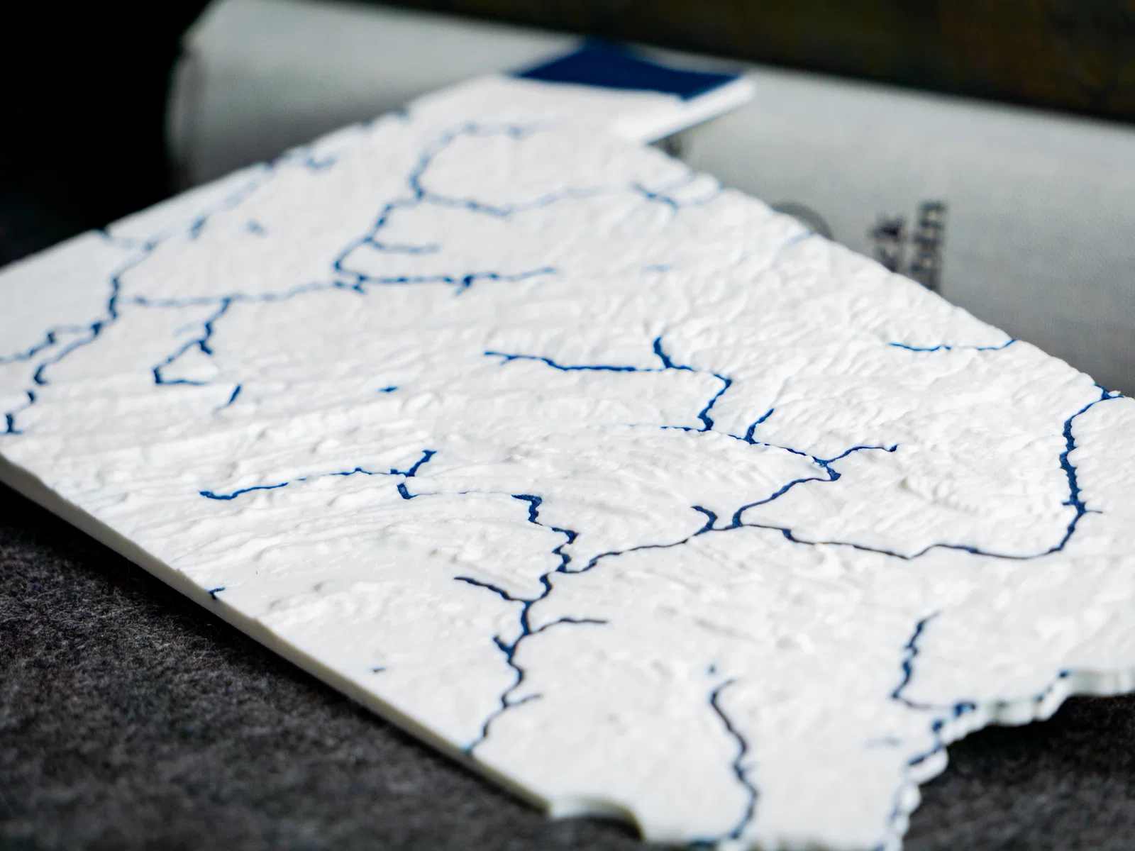 Muốn khoe rõ suối, hồ và đường bờ thì dùng filament glow-in-the-dark hoặc translucent—hoặc đơn giản là chọn màu khác với màu nền!
