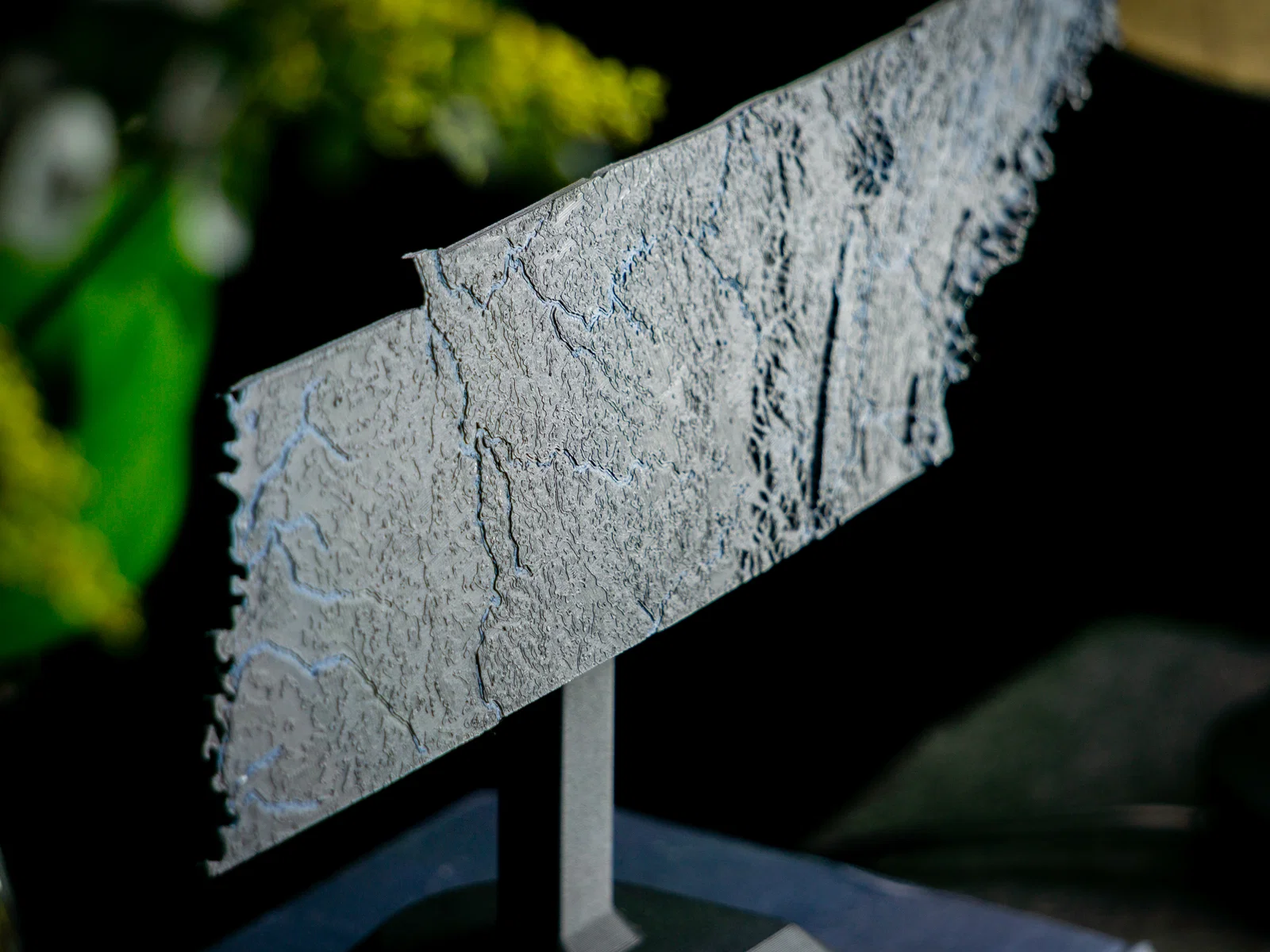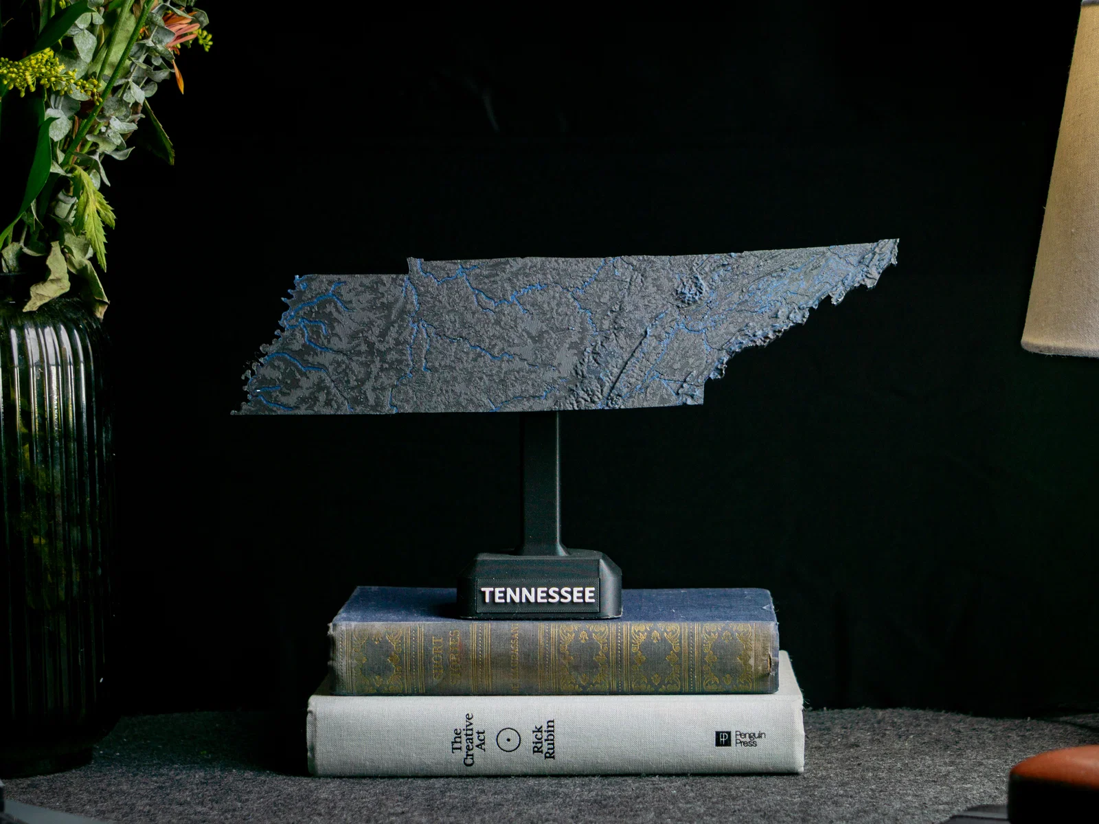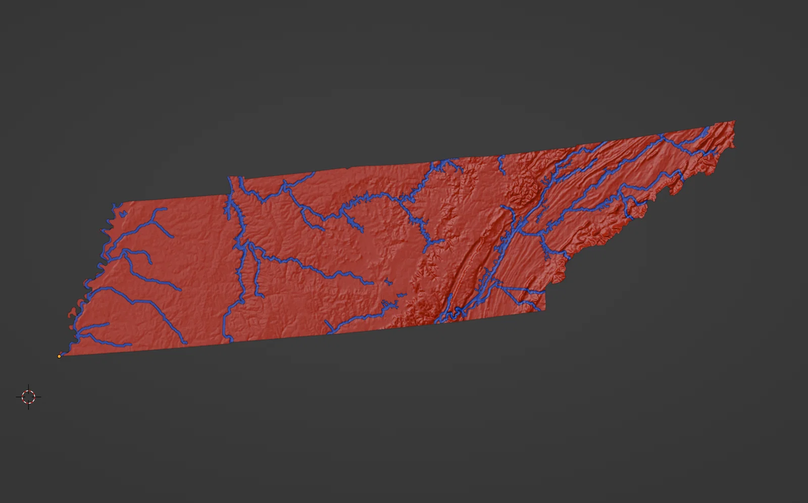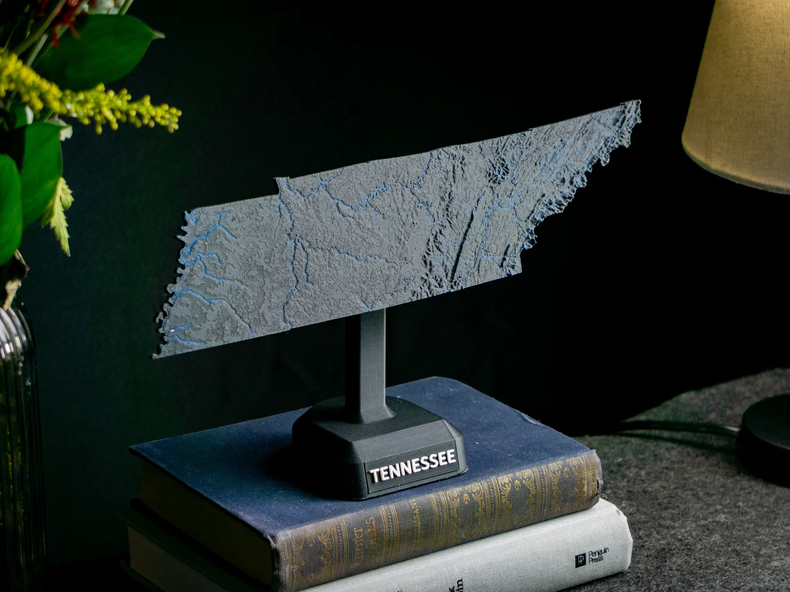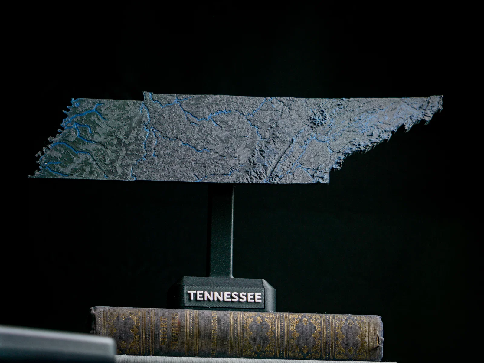 Bản đồ địa hình nổi Tennessee (TN), USA in 1 màu hoặc 2 màu, có núi, suối/sông và hồ. File 3MF tối ưu cho in dual color, các phần land/water đã căn thẳng hàng, phù hợp Cura/PrusaSlicer.