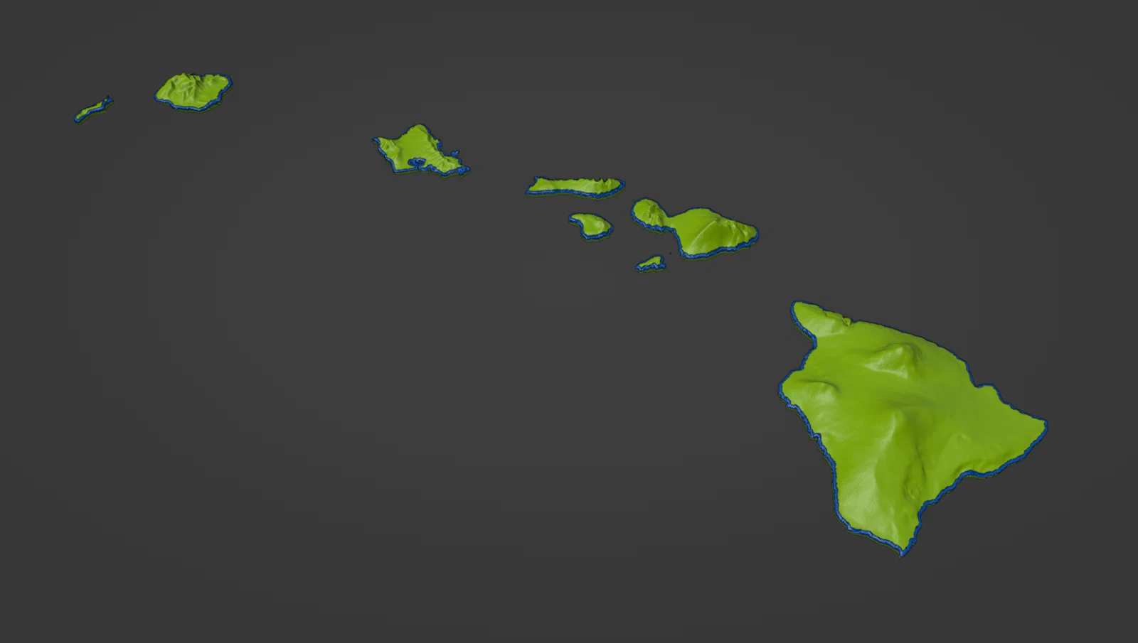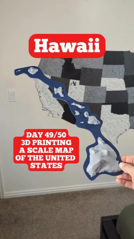 Bản đồ địa hình 2 màu (dual color) cho Hawaii – cụm đảo phía Đông Nam, làm nổi bật đường bờ biển và thủy hệ. Dùng phép chiếu UTM zone 4N để hình dáng đảo chính xác hơn; có file 3MF cho in dual/single extrusion.