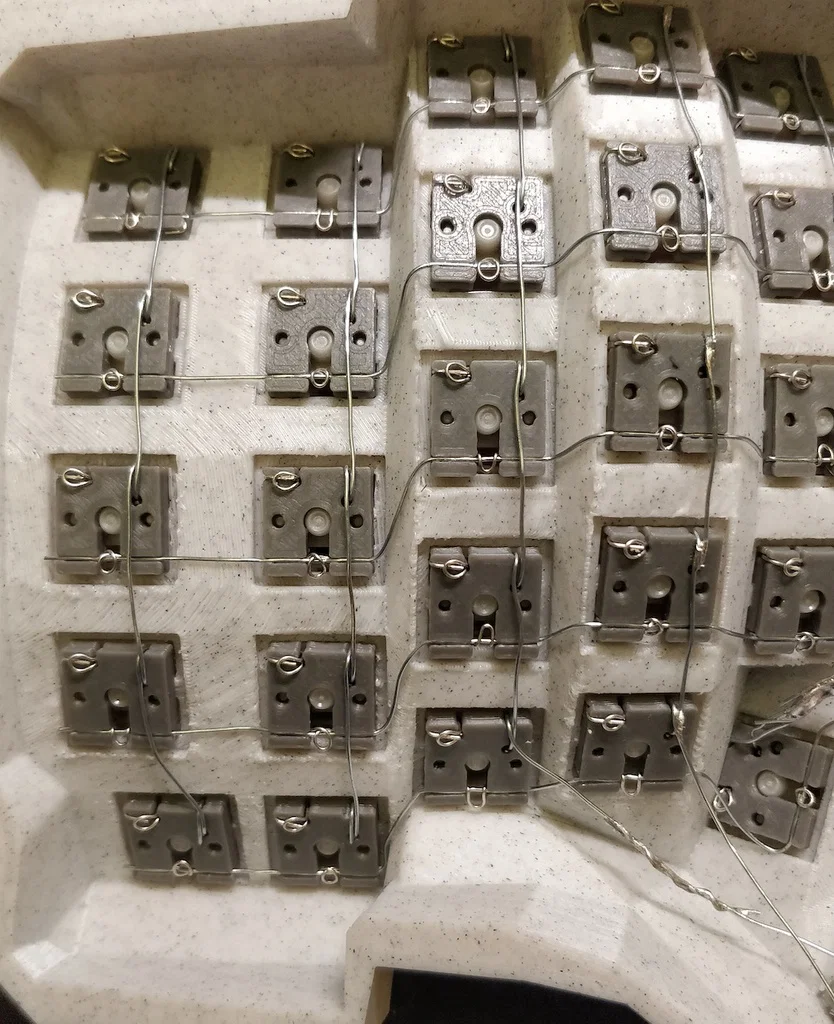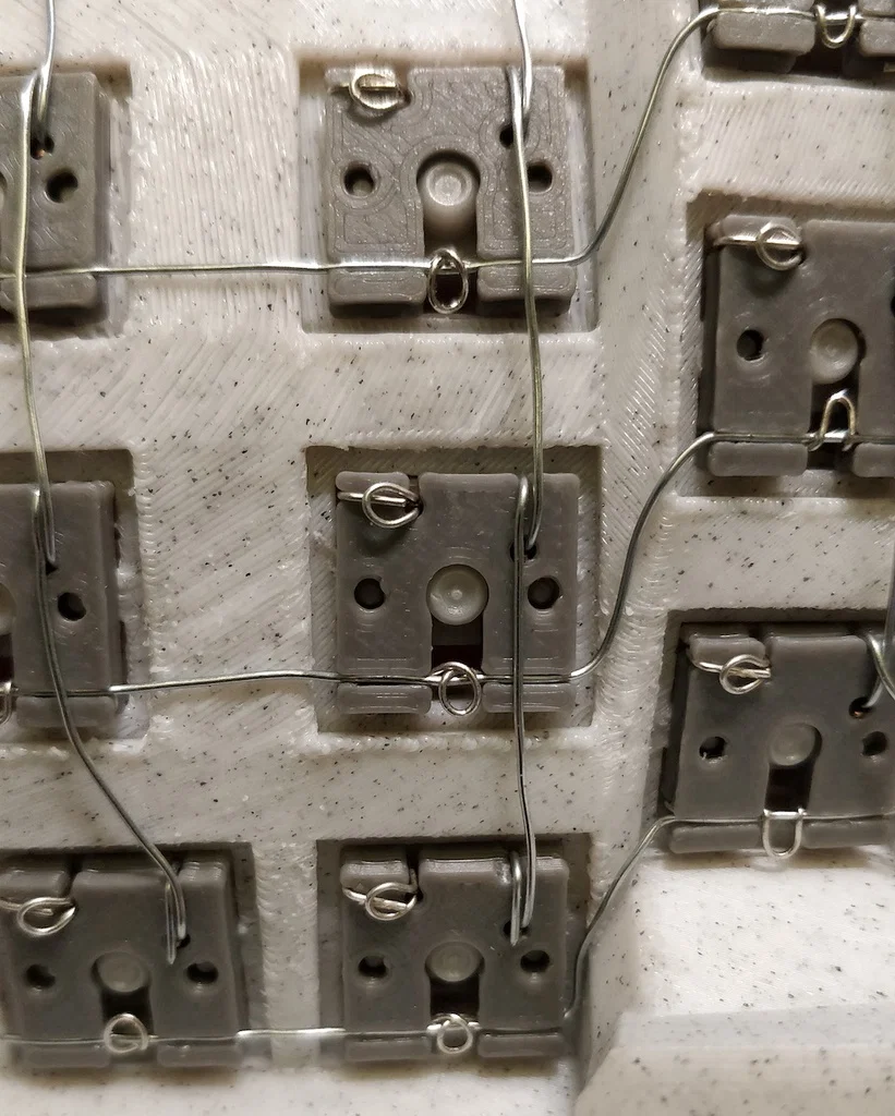 Đây là một cách đi dây ma trận bàn phím hoàn toàn không cần hàn (solderless). Dùng các chi tiết in 3D này, diode chân cắm (through hole), và dây lõi cứng (solid core wire), bạn có thể lắp một ma trận keyswitch phù hợp với hình dạng của bất kỳ không gian build nào, và còn có thêm lợi ích là có thể tháo ra thay thế toàn bộ các switch.