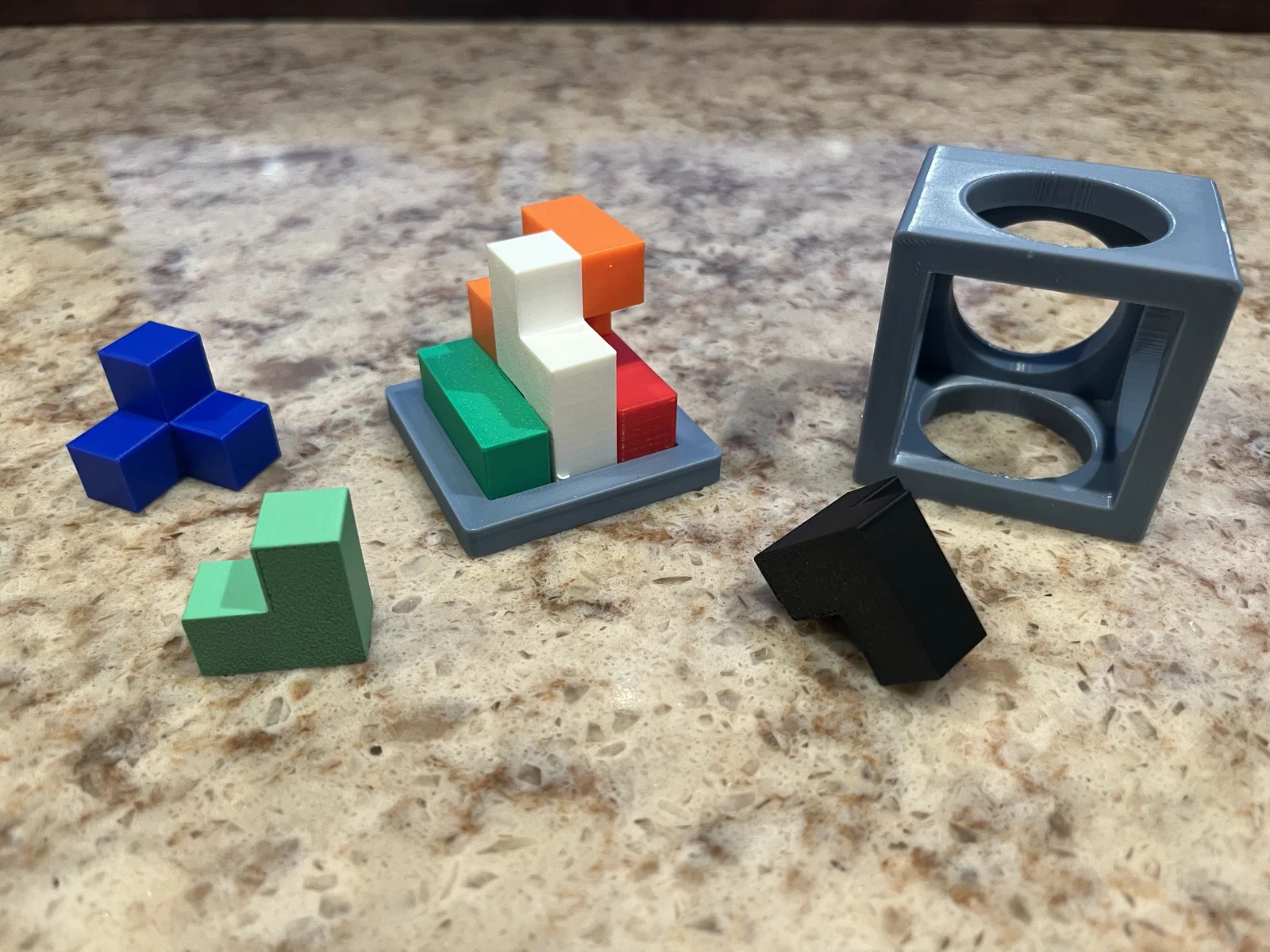 Soma Cube (Puzzle Cube) gồm 7 mảnh ghép để lắp thành khối lập phương, kèm holder giúp cất gọn và tránh thất lạc. Khuyến nghị in có supports cho phần trên của holder ở các lỗ tròn.