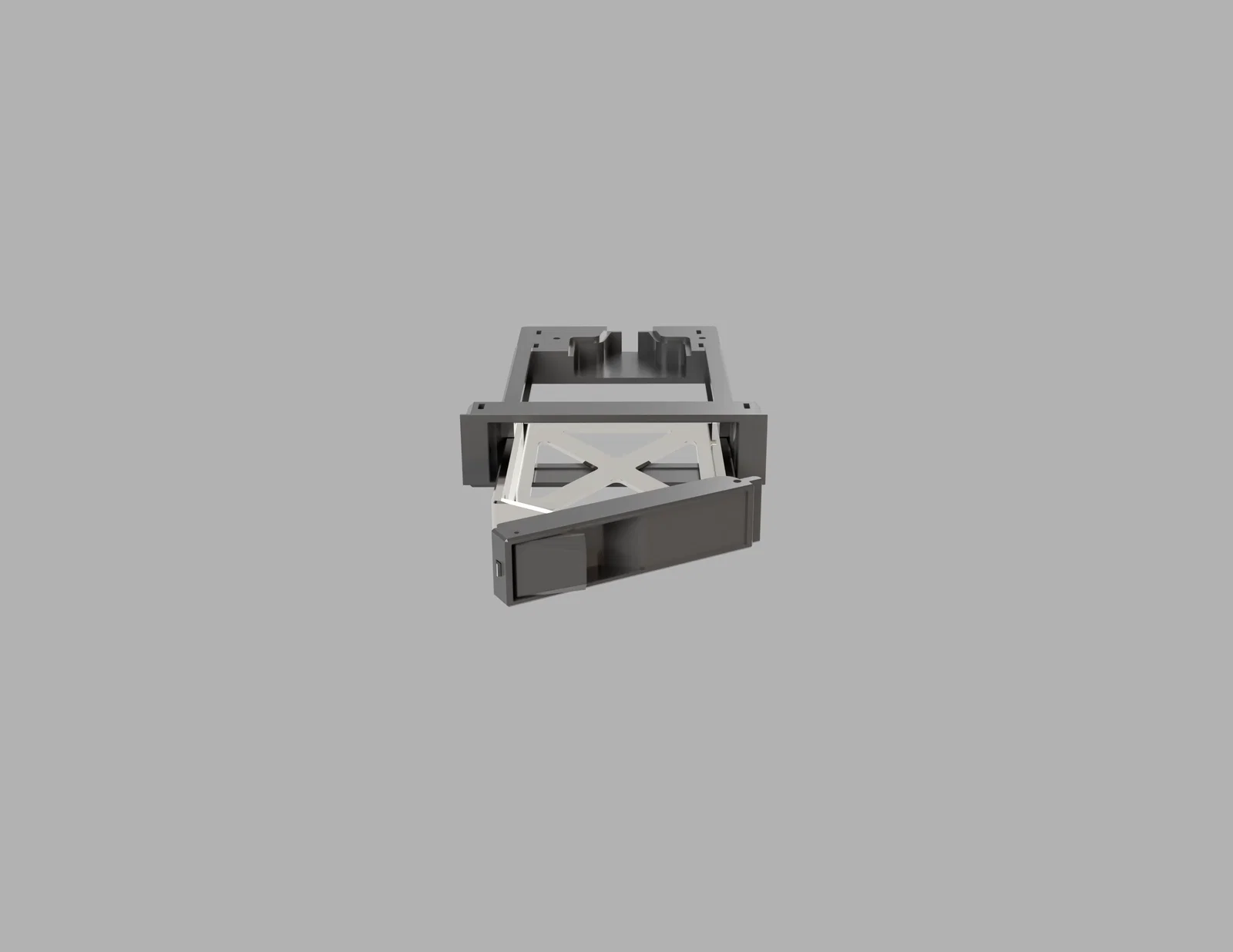 Drivebay hotswap dùng cho 2.5" SATA HDD/SSD, tương thích USB SATA adapter. Chốt khóa/lò xo print-in-place, tay gạt vừa kích lò xo vừa kéo khay. Có file STEP; khuyến nghị in PLA cho phần bay ngoài.