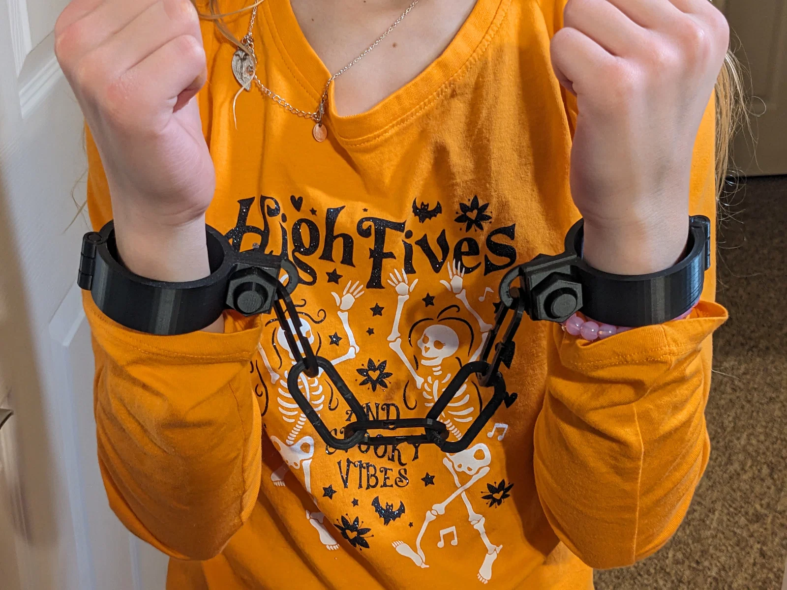 Bộ còng tay và còng chân size trẻ em, có 2 kích cỡ cho đồ hóa trang Halloween. Thiết kế print-in-place: còng bấm “click”, bản lề PiP và sợi xích in phẳng, dễ in với nozzle 0.4mm, layer 0.2mm.