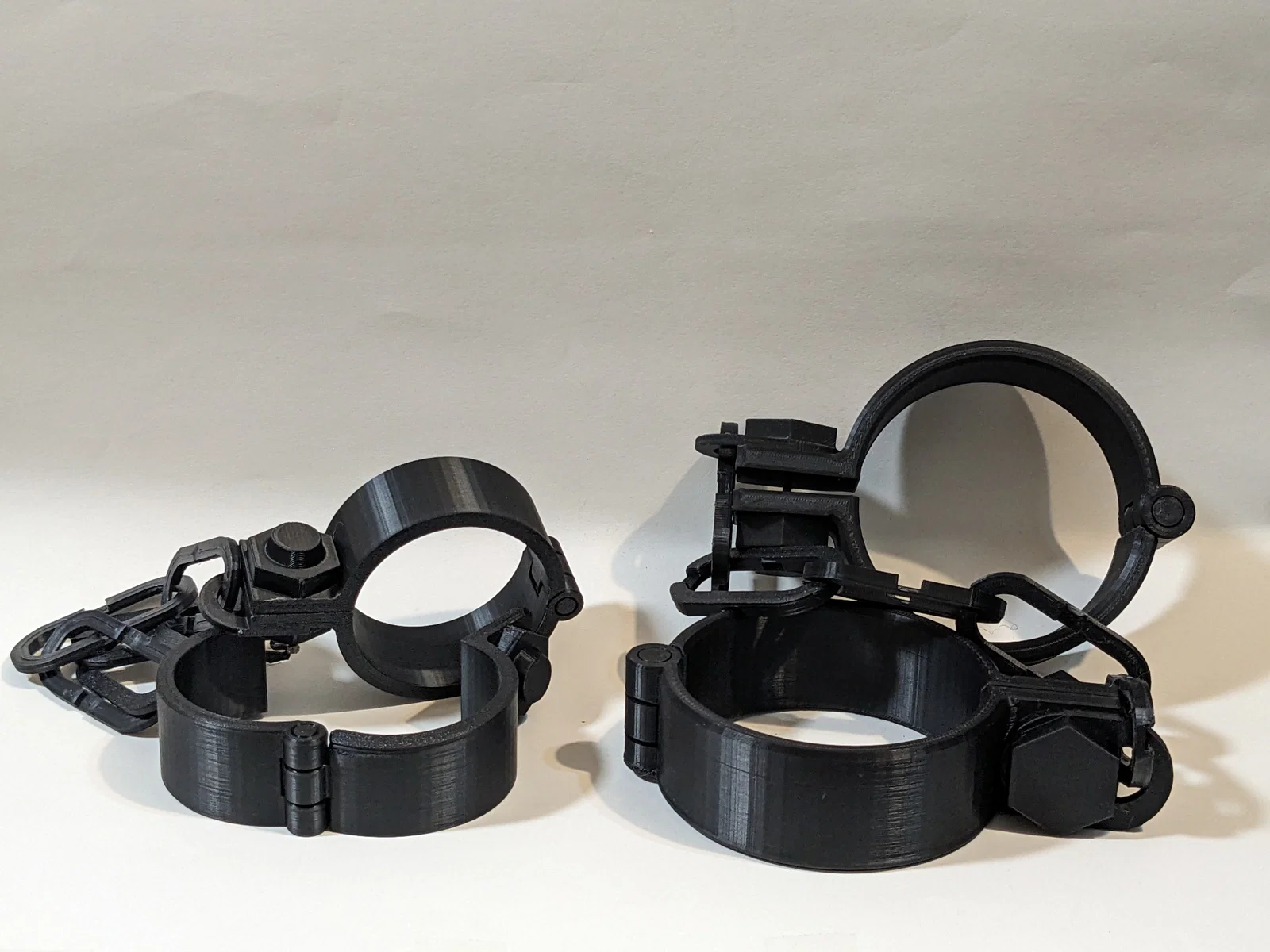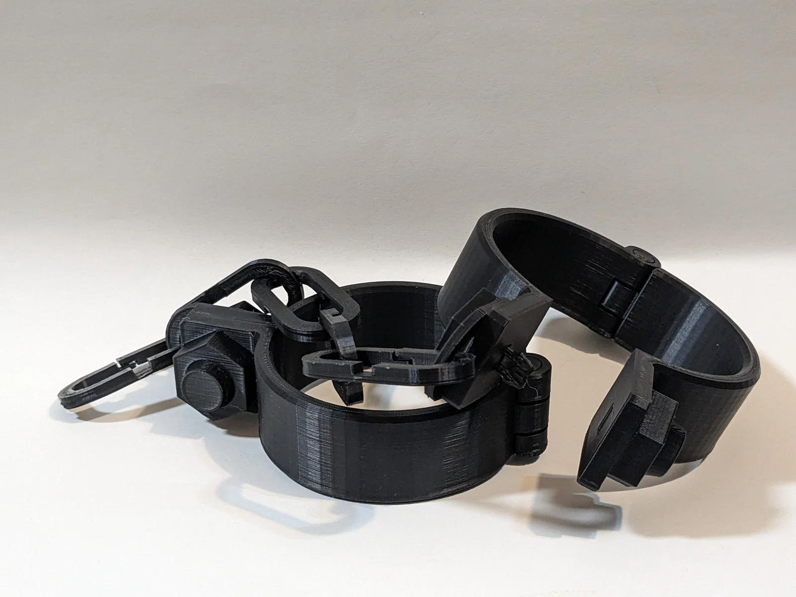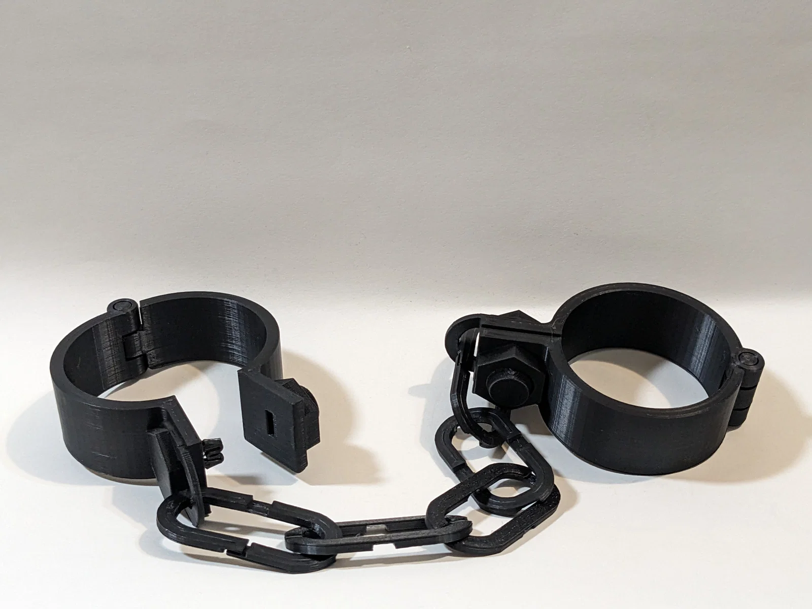 Bộ còng tay có bản lề và bấm khóa lại nghe “click”. In 1 kẹp khóa (closure clip) cho mỗi cái còng. Thiết kế print-in-place (phần còng và phần xích tách riêng). Sợi xích in nằm phẳng, chỉ cần bridging ngắn.