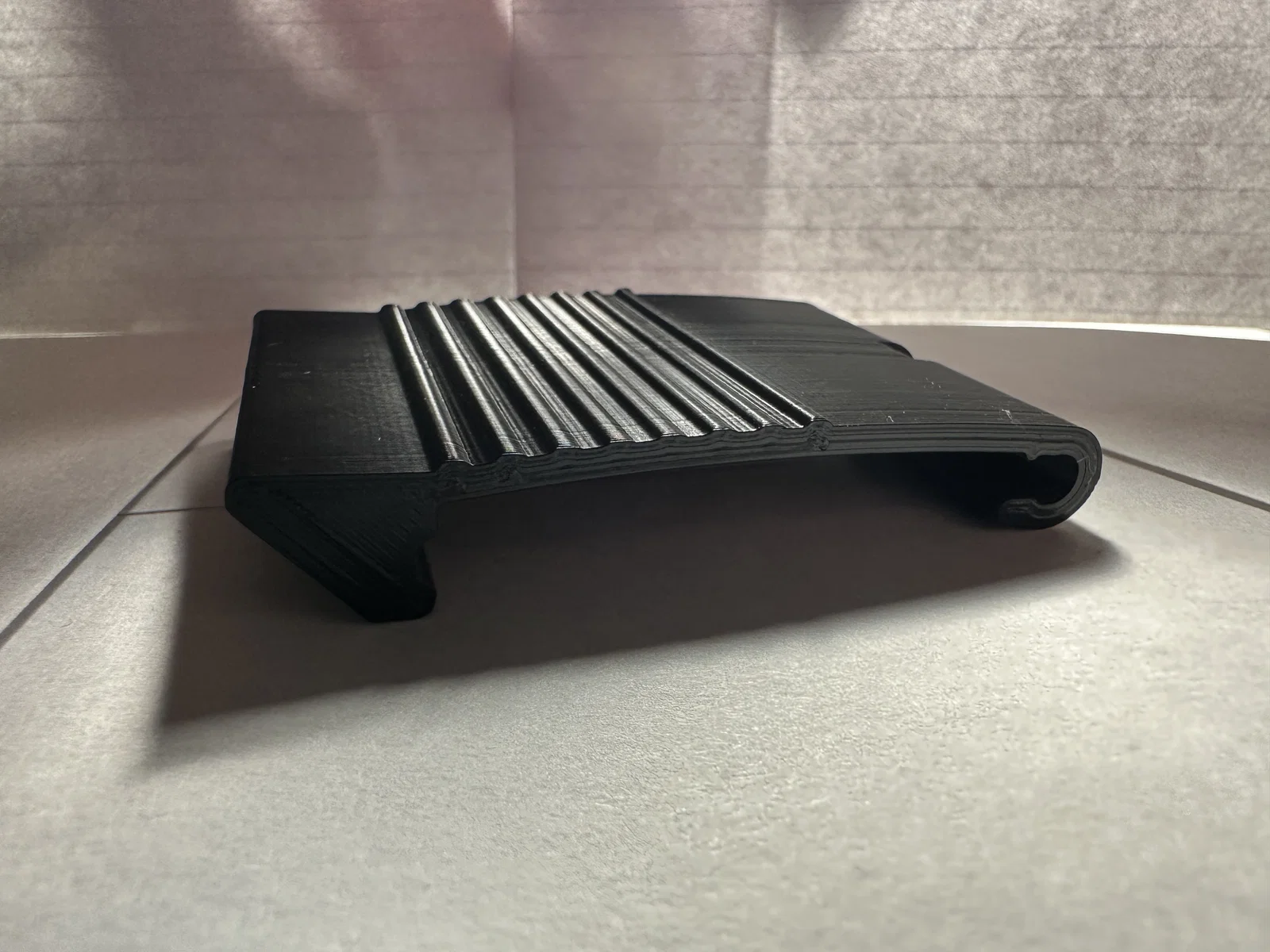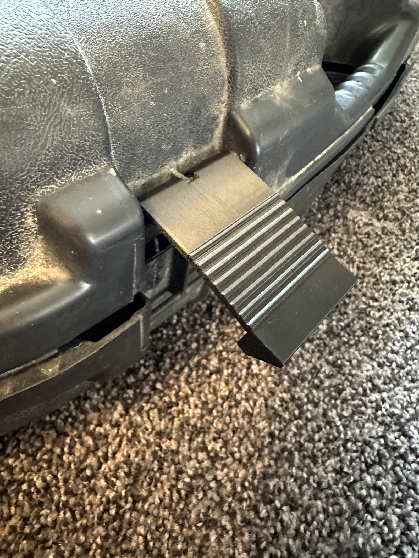 Mẫu chốt khóa (latch) thay thế cho hộp cứng Plano Protector Model# 1110, dùng cho bow/gun case. In SunLu PLA (đen) với infill 20%, walls 2, layer 0.2mm; cần tree supports cho hai đầu có rãnh.