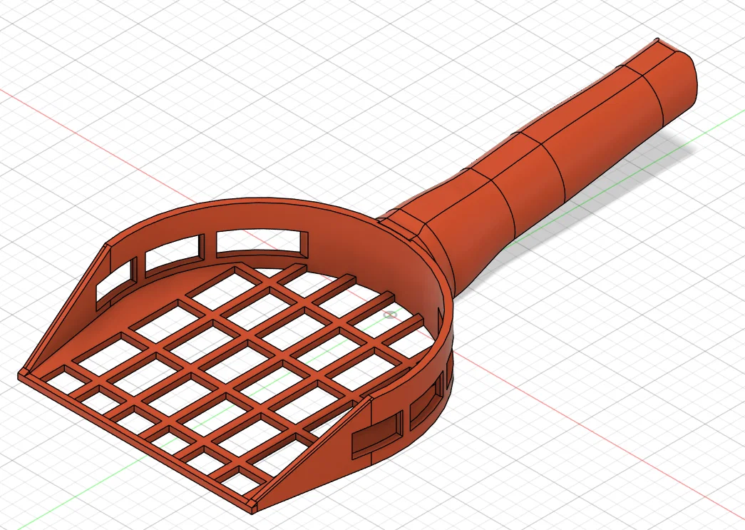 Xẻng xúc phân cho khay cát mèo với các lỗ lớn để sàng cực sạch: xúc lên chủ yếu là phân, hạn chế kéo theo cát. In khoảng 50g filament, dùng PETG hoặc PLA đều ổn; cần supports cho lỗ dọc và tay cầm.