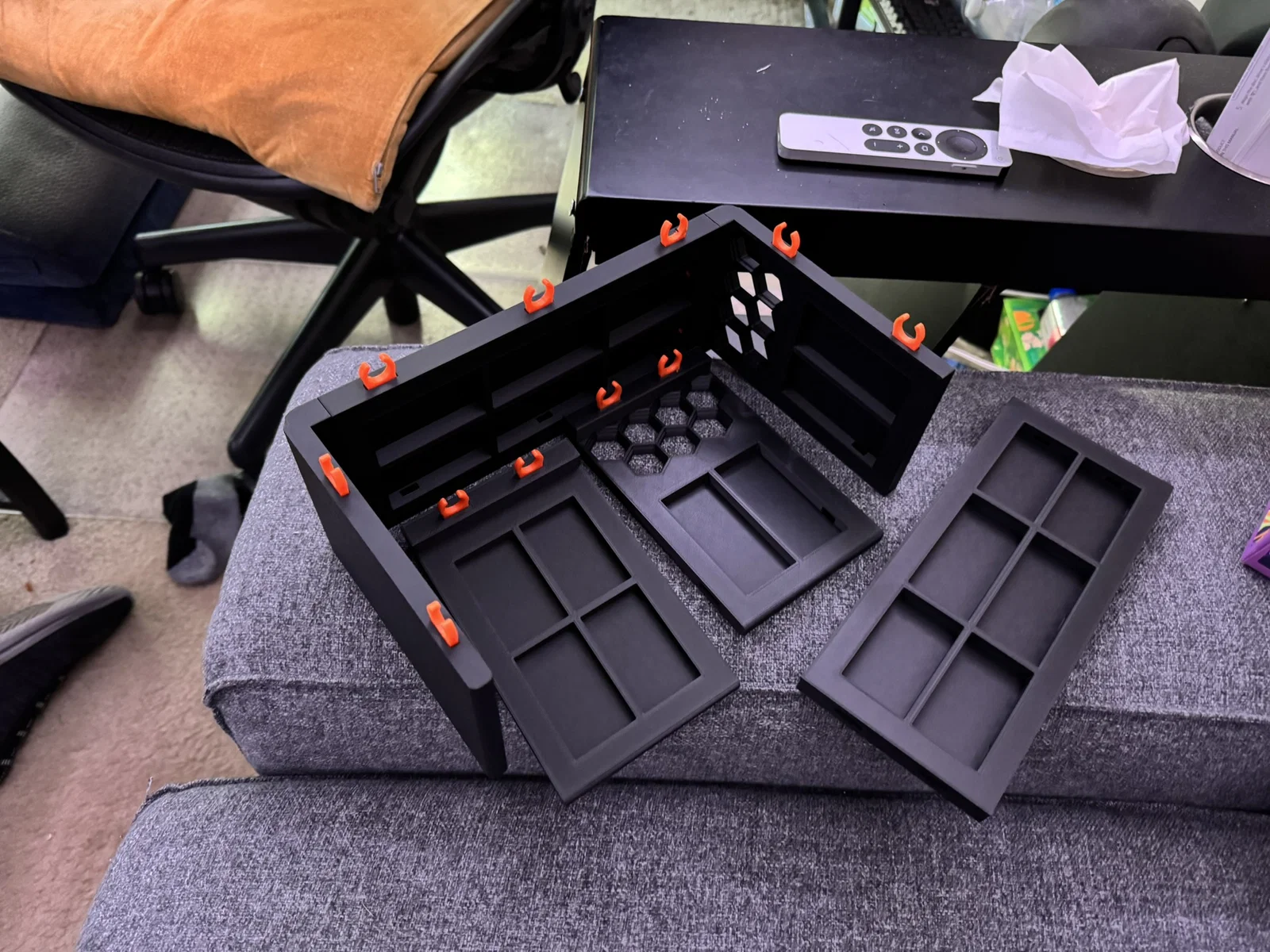 (Ghi chú: Tới lúc mình làm và in dự án này được hơn nửa chặng đường thì mới phát hiện một lỗi lớn: hướng của mấy lục giác bị sai! Làm cho mọi thứ khi gắn lên sẽ bị xoay 45 độ. Mà… khi mình gắn holder và để remote vào thì lại thấy cũng khá thích! Chắc gọi là “lỗi vui vẻ” vậy. Nếu có nhu cầu, mình có thể cân nhắc thiết kế thêm một miếng hông khác với honeycomb đúng hướng.)