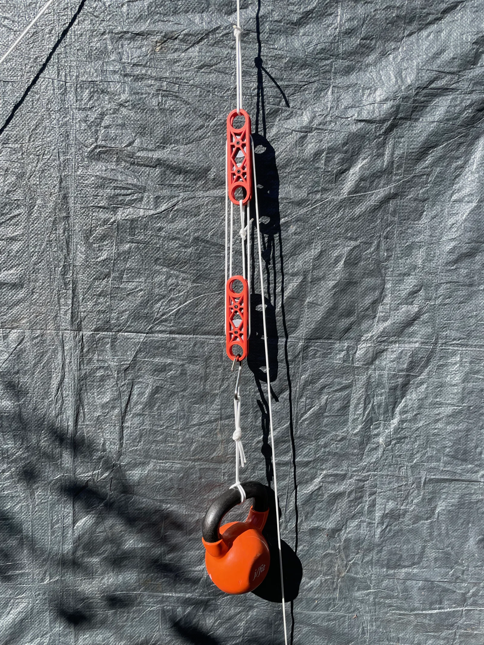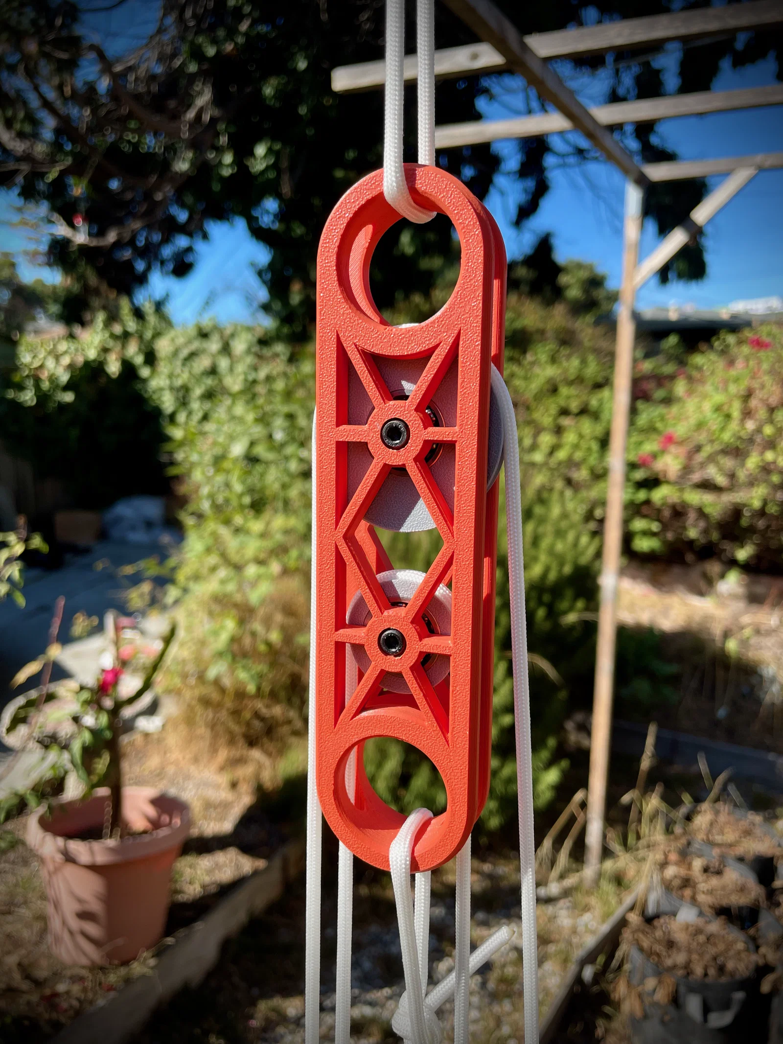 Phiên bản bánh đôi lớn hơn của mẫu nhỏ hơn. Làm 2 cái pulley này để phối hợp với nhau và đạt lợi cơ khí 1:4 rất ấn tượng. Ví dụ, một bộ pulley này có thể nâng 40 lb chỉ với lực kéo xuống 10 lb.