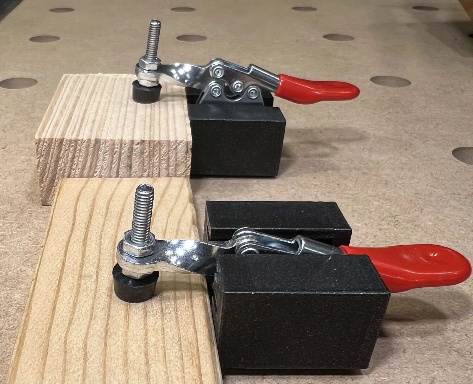 Đế slide-in cho kẹp toggle GH201A, dùng cho lỗ benchdog MFT 19/20mm. Có 3 rãnh để thay đổi chiều cao kẹp, không cần ốc/vít. In PLA theo hướng STL và dùng supports; có thể cần chỉnh scale/flow rate.