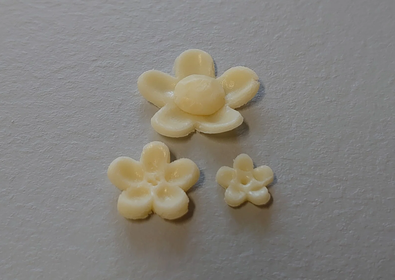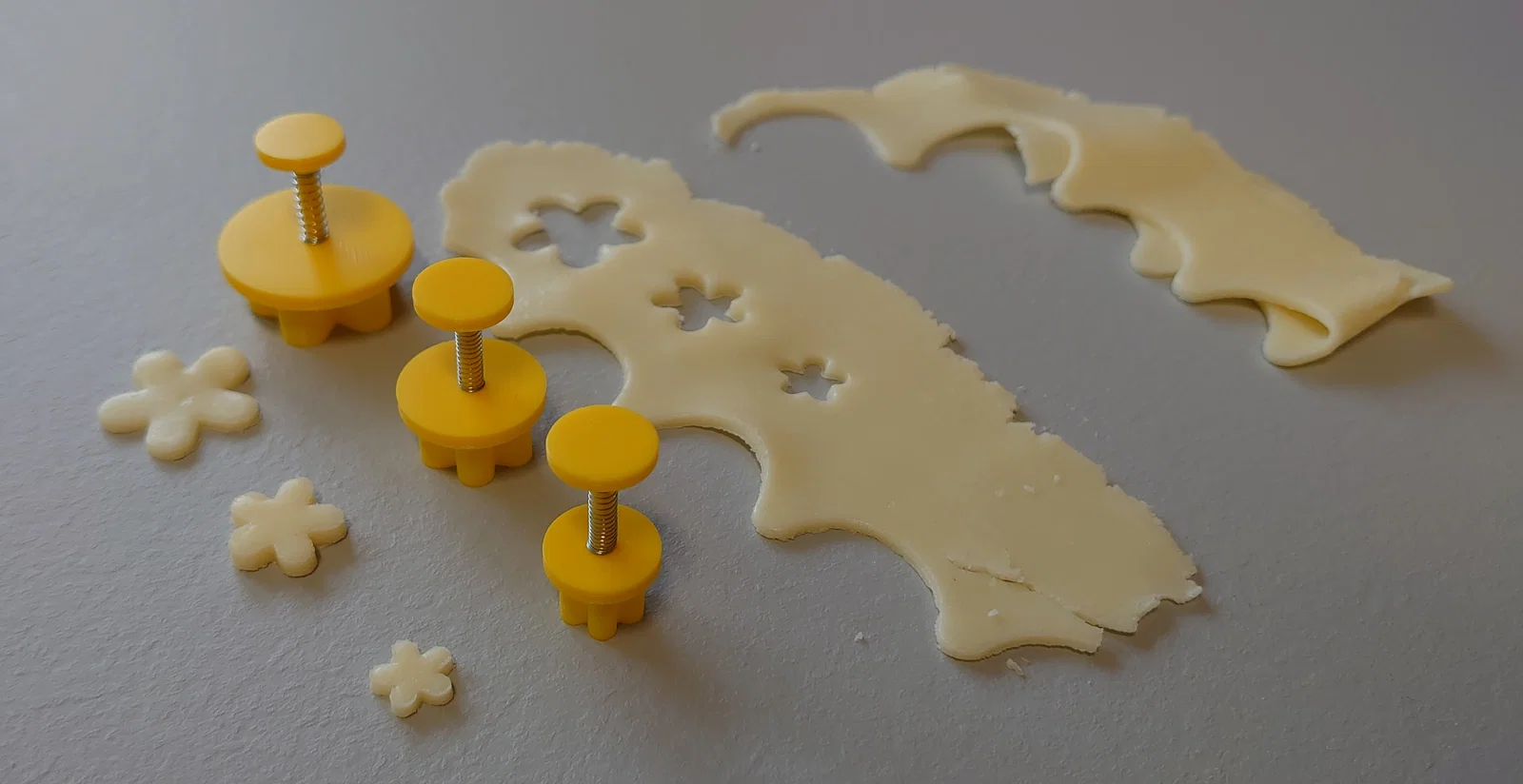 Khuôn cắt hoa 5 cánh dạng piston, dùng để cắt hoa marzipan phục vụ trang trí, ví dụ như trang trí bánh kem. / Pětilisté pístové vykrajovátko květiny které slouží k vykrajování marcipánových květin na zdobení například dortů.