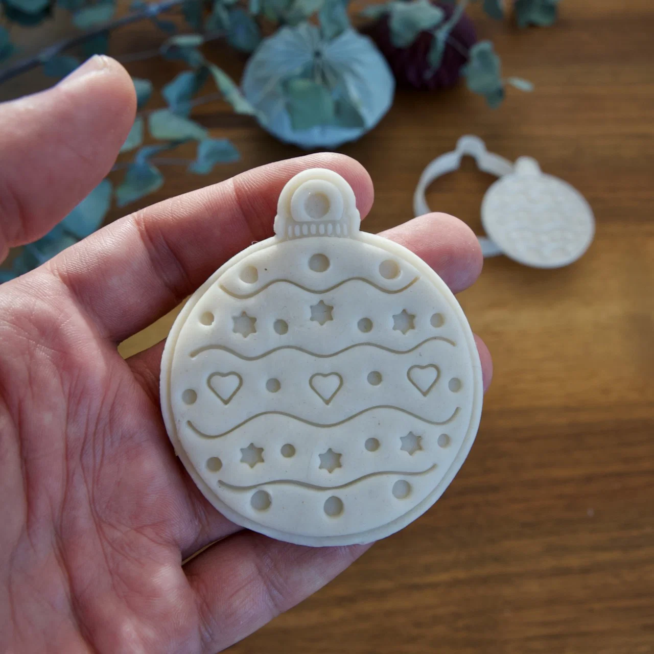Mẫu Cookie Cutter Christmas Tree Ball dạng 2 mảnh giúp linh hoạt khi tạo hình quả châu/cục trang trí Noel. Có stamp kèm tay cầm dễ thao tác, hợp dùng với bột cookie mịn, fondant hoặc play dough.