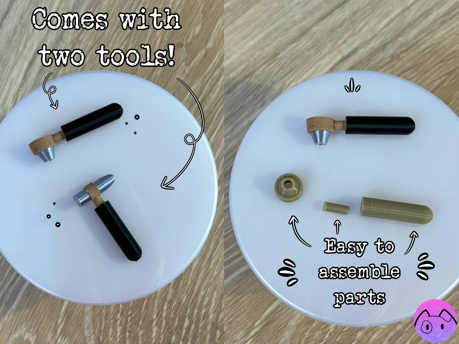 Phần đầu của otoscope và búa phản xạ có thể gắn vào cán cầm đa dụng (và chốt). Bạn hãy in 1 cán và 1 chốt cho mỗi đầu dụng cụ mà bạn định dùng. Ví dụ nếu bạn muốn dùng cả búa phản xạ lẫn otoscope, bạn sẽ cần in 2 cán và 2 chốt cho cán.