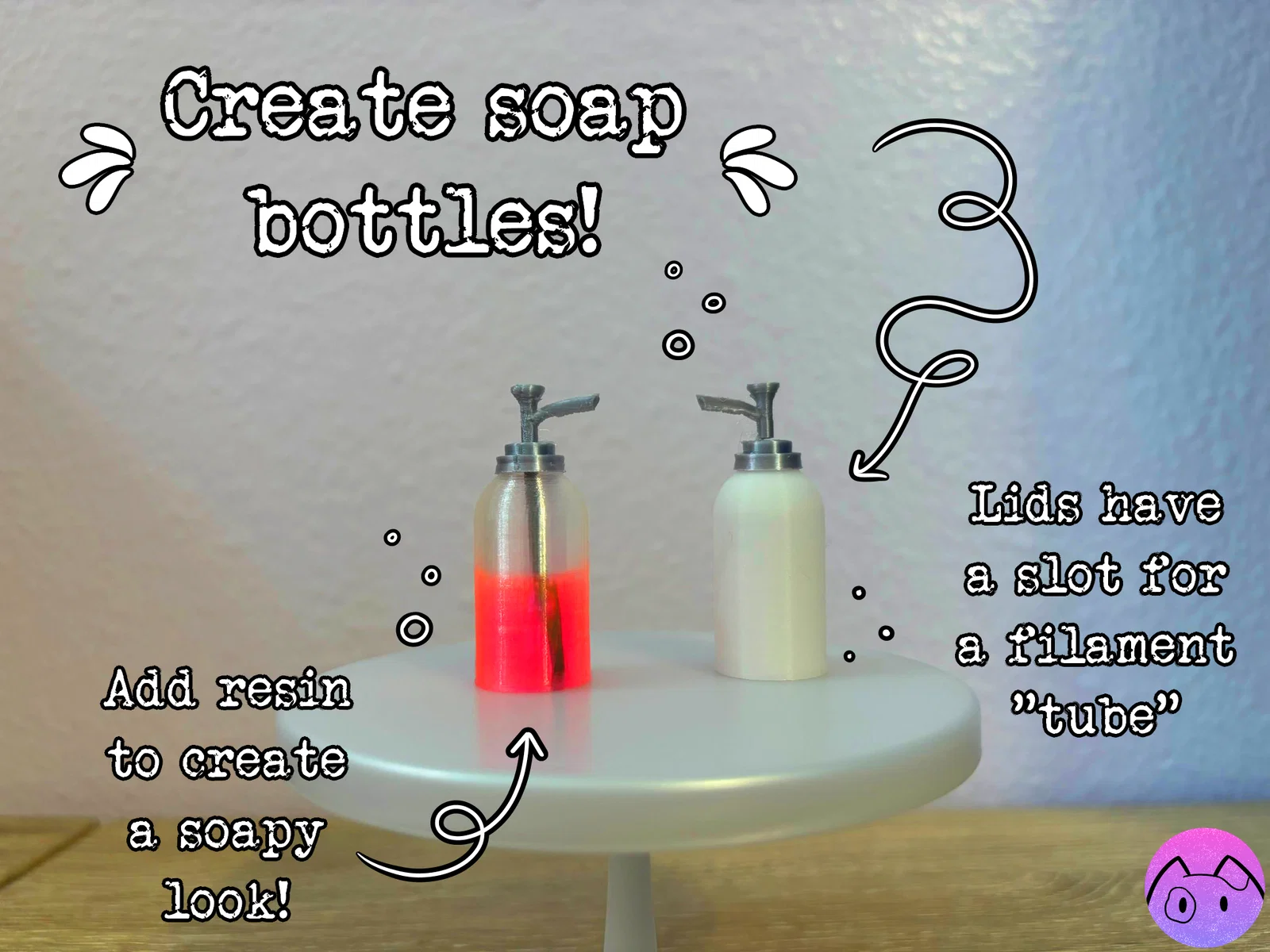 Các khớp nối trên các mảnh ống nghe và phần bơm của chai xà phòng được thiết kế để vừa và giữ chặt filament 1.75mm. Tùy máy in của bạn, các khớp này có thể hơi lỏng hoặc hơi chặt. Có thể cần thêm chút keo hoặc chà nhám nhẹ để các phần ráp khít với nhau.