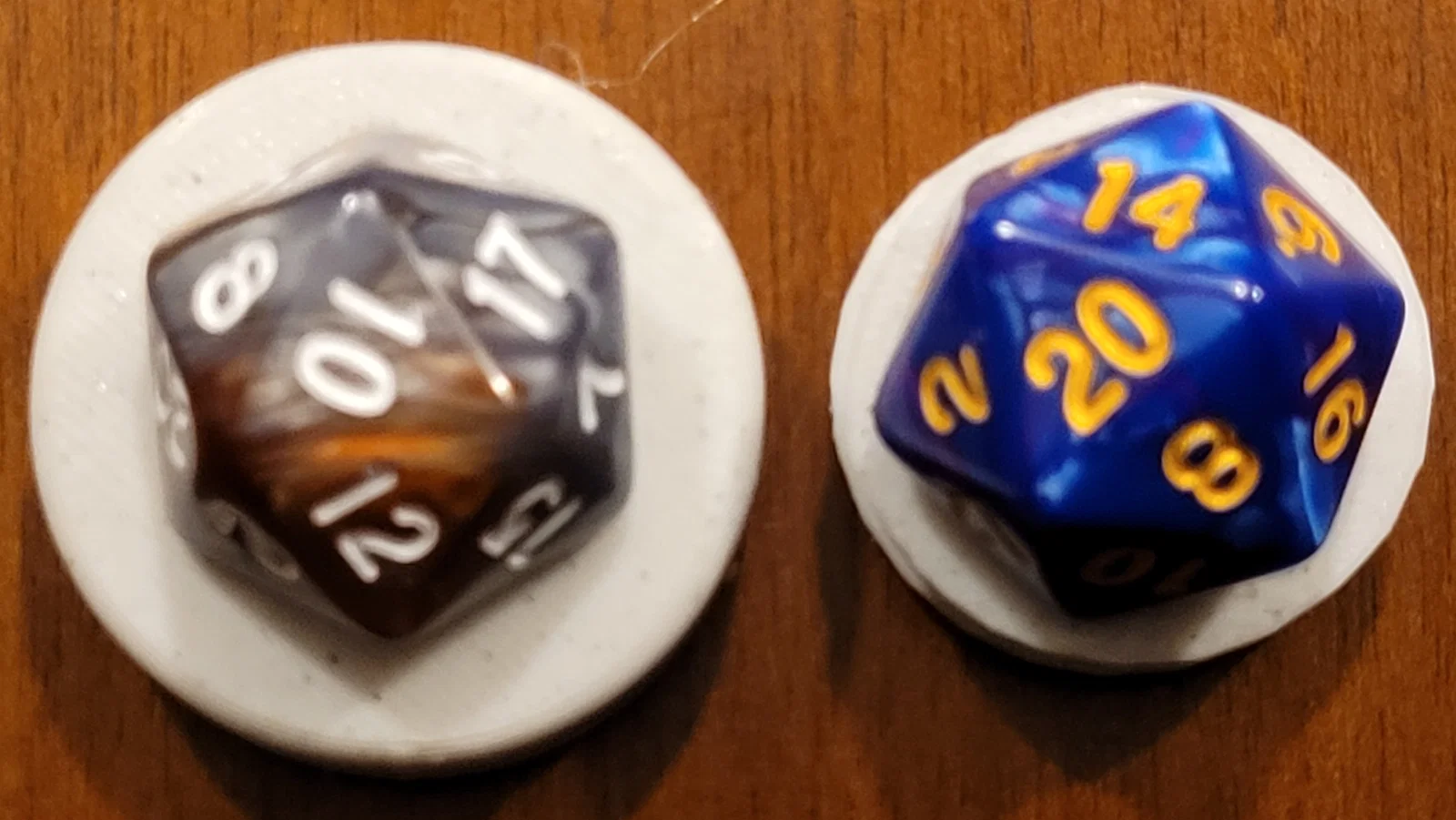Dù xài vẫn ngon lành, nhưng mình thấy tổng thể nó hơi “phình” kích thước, nhất là khi để lên mấy lá bài Borderlands: Mr Torgue Arena of Badassery (MTAOB) của mình — chỗ mình quyết định dùng D20 để theo dõi máu boss/địch đặc biệt (thay vì wound tokens của game).