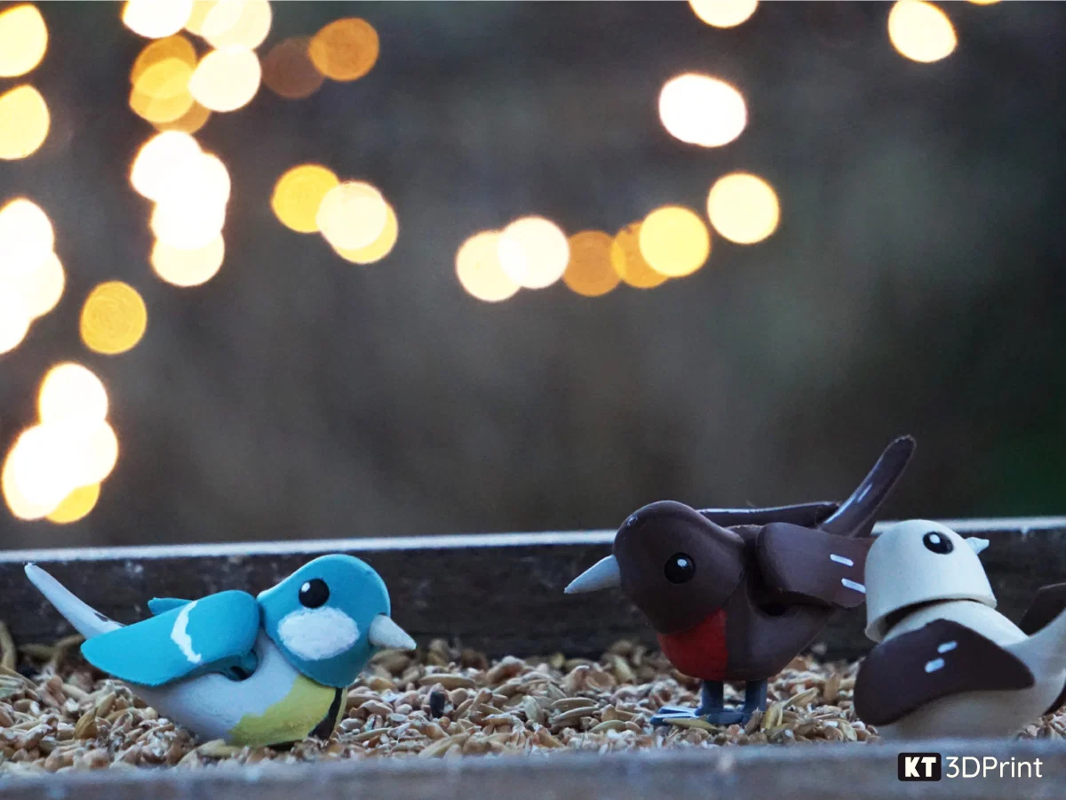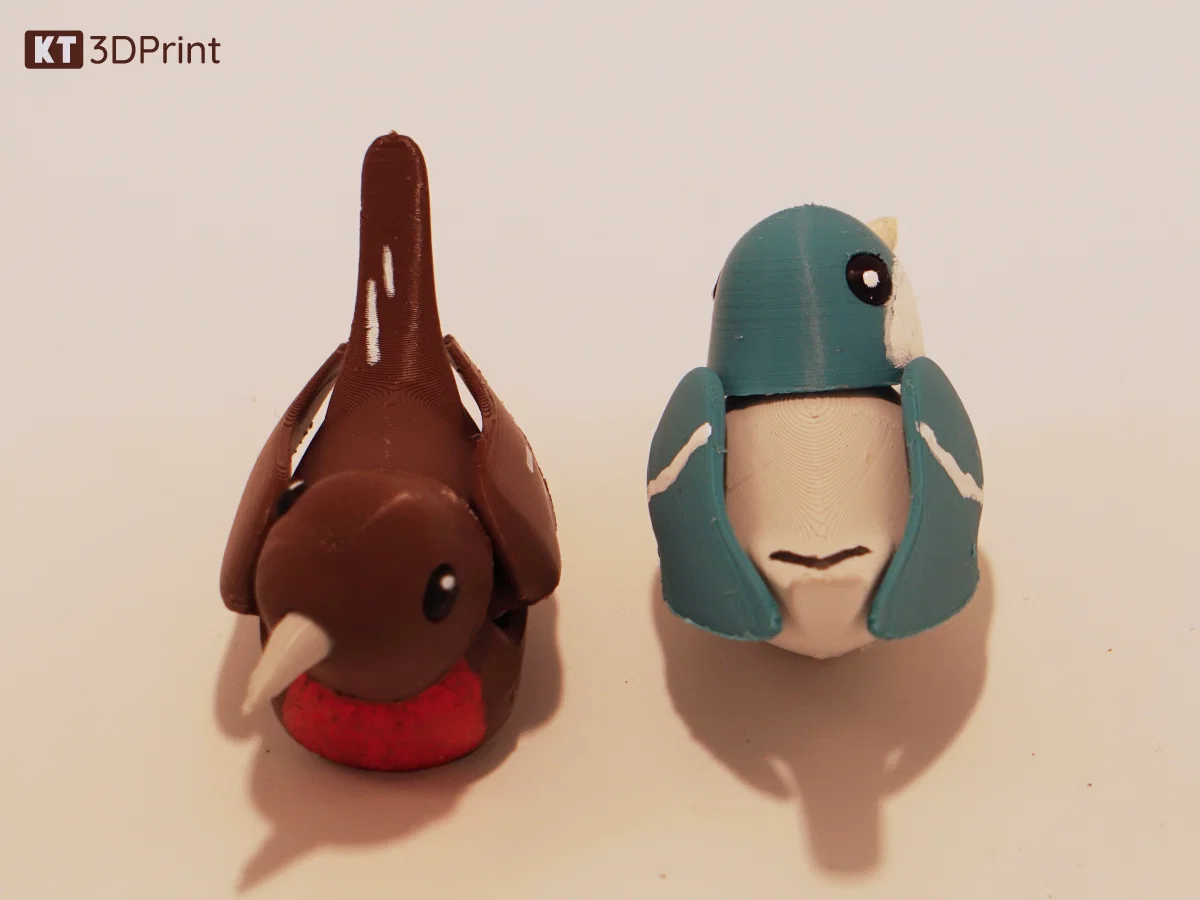 Chú chim nhỏ xinh có khớp cử động ở đầu và cánh, tạo dáng linh hoạt, mỗi con một cá tính. In rất dễ, không cần support, chỉ cần bed adhesion tốt và ít infill. Mắt và mỏ dán keo là xong.