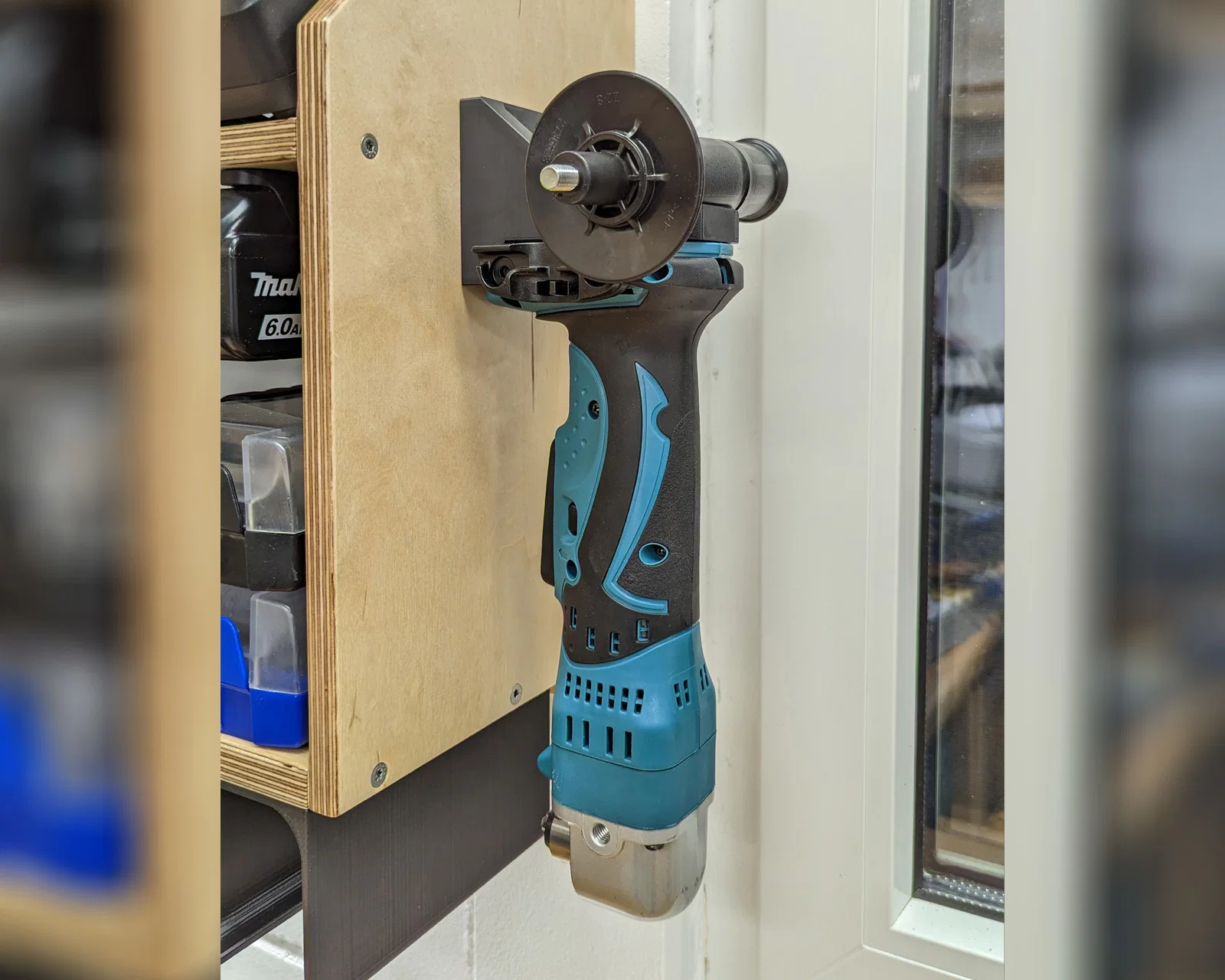 Ngàm/giá treo để cất các dụng cụ Makita 18V (như đèn, multitool, khoan góc hoặc máy mài góc) theo kiểu treo úp ngược lên tường. Phía trên còn có phần tích hợp để để thêm pin hoặc cất tay cầm.