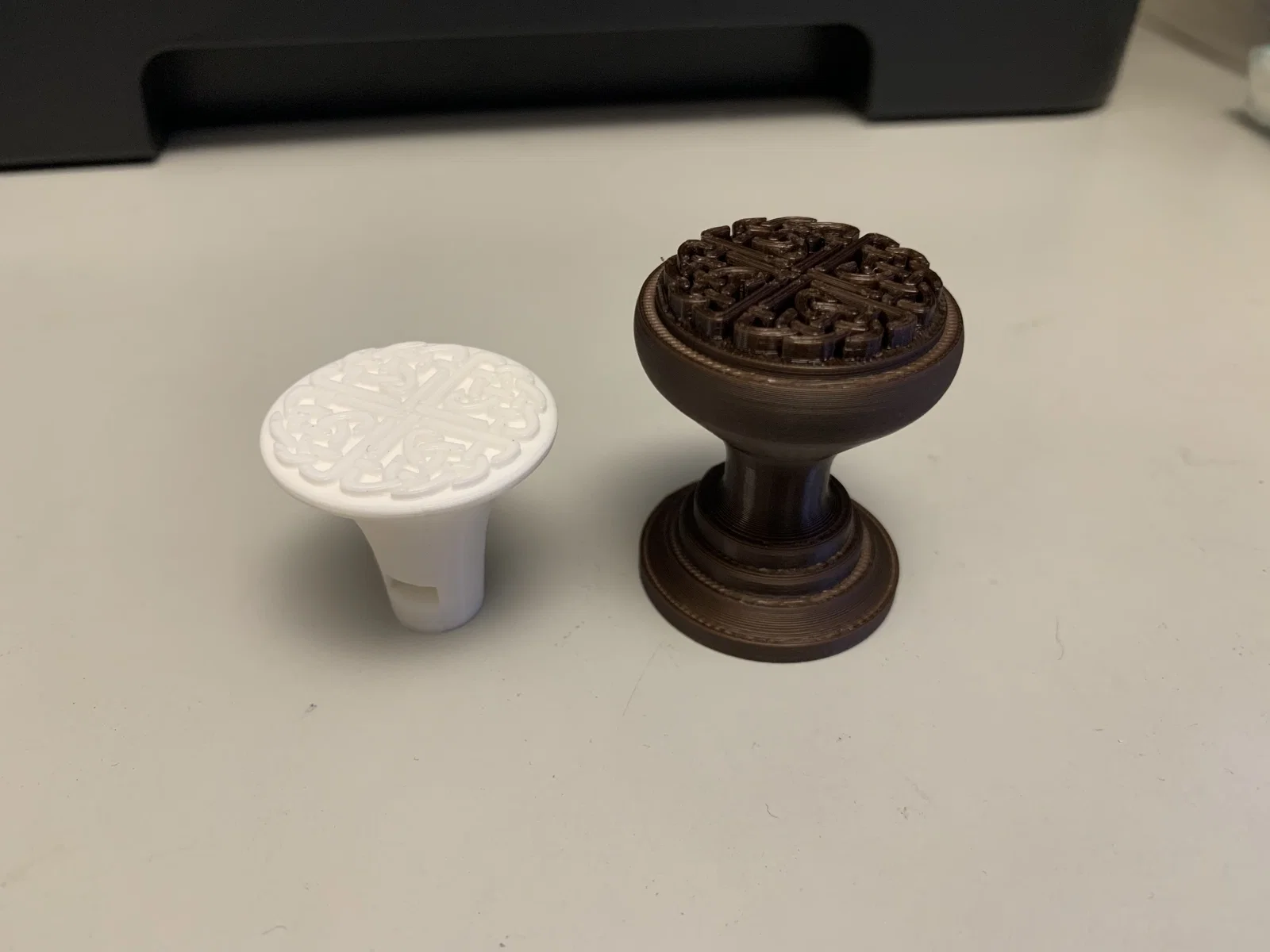 Núm cửa này được thiết kế để gắn bằng một con bu-lông máy tiêu chuẩn 8-32 x 2.5" và long đền bản rộng (fender washer). Để “bắt” (capture) một đai ốc 8-32 bên trong bản in, hãy tạm dừng in ở layer 45 (giả sử dùng layer height .2mm), đặt đai ốc vào, rồi tiếp tục in.