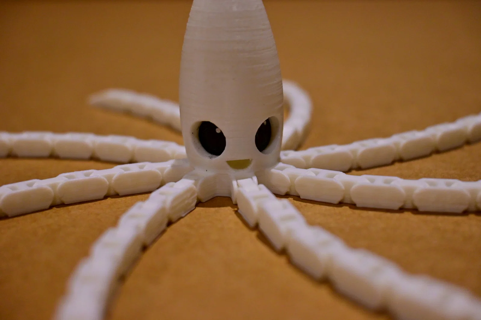 Mẫu Flexi Articulated Mini Squid siêu dễ thương, dạng articulated uốn dẻo. In không cần supports/rafts, PLA, tolerance 0.2 mm. Mắt in đen, thân màu tùy chọn; có thể chỉnh độ mềm tentacles bằng initial layer flow/expansion.