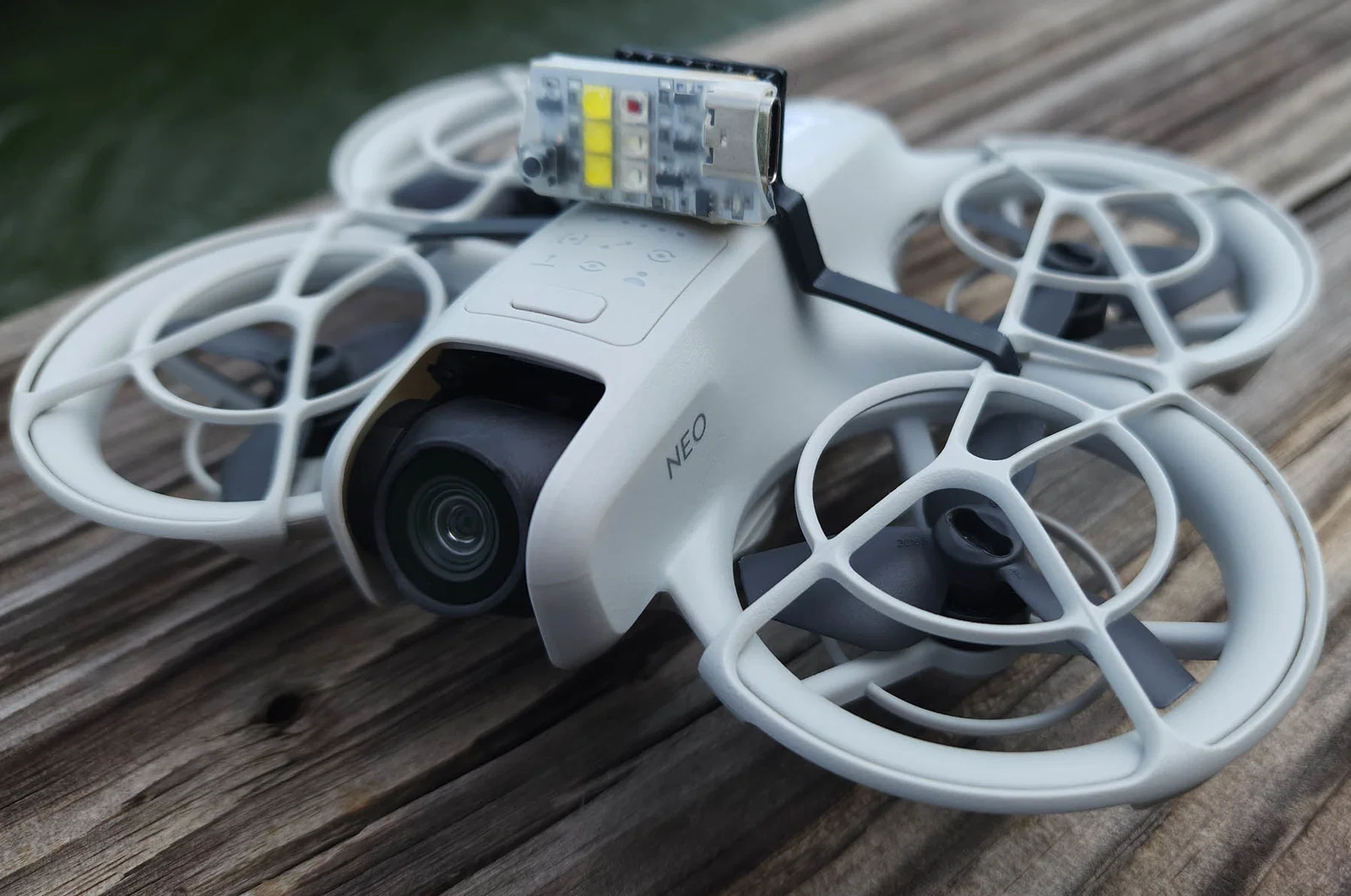 Ngàm gắn đèn phía trên cho DJI Neo, thiết kế để dùng miếng Velcro phẳng thay vì kẹp đèn pin. Siêu nhẹ dưới 2g; khi gắn đèn strobe Vifly như hình tổng vẫn dưới 9g, hỗ trợ chiếu sáng cho camera trong nhiều tình huống.
