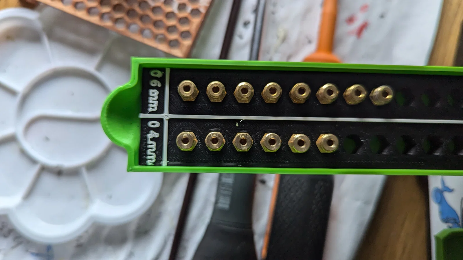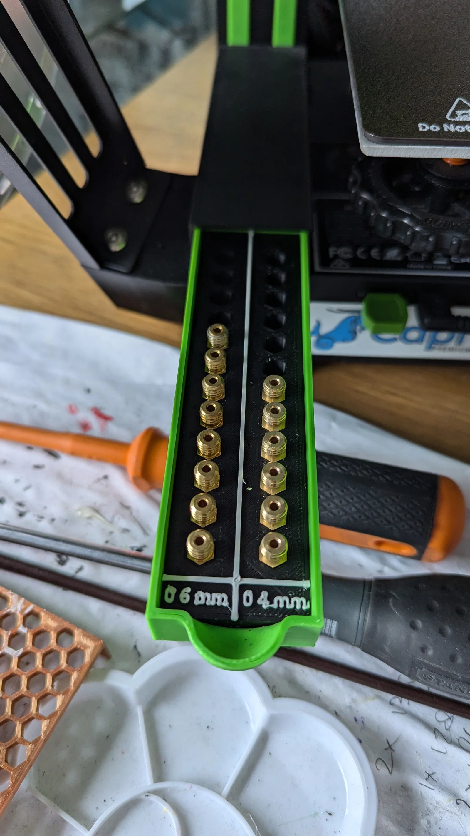 Đây là một cái ngăn kéo nhỏ, gắn vừa ở mặt trước bên trái của khung kim loại 40x40. Nó trượt vào các rãnh V-slot. Mình làm thêm một khay insert để vừa 24 cái nozzle, và có thêm phần ghi chú để biết nozzle cỡ nào. Do mình chỉ có 0.4mm và 0.6mm nên mình ghi theo 2 cỡ đó. Bạn hoàn toàn có thể tự làm bản của mình.