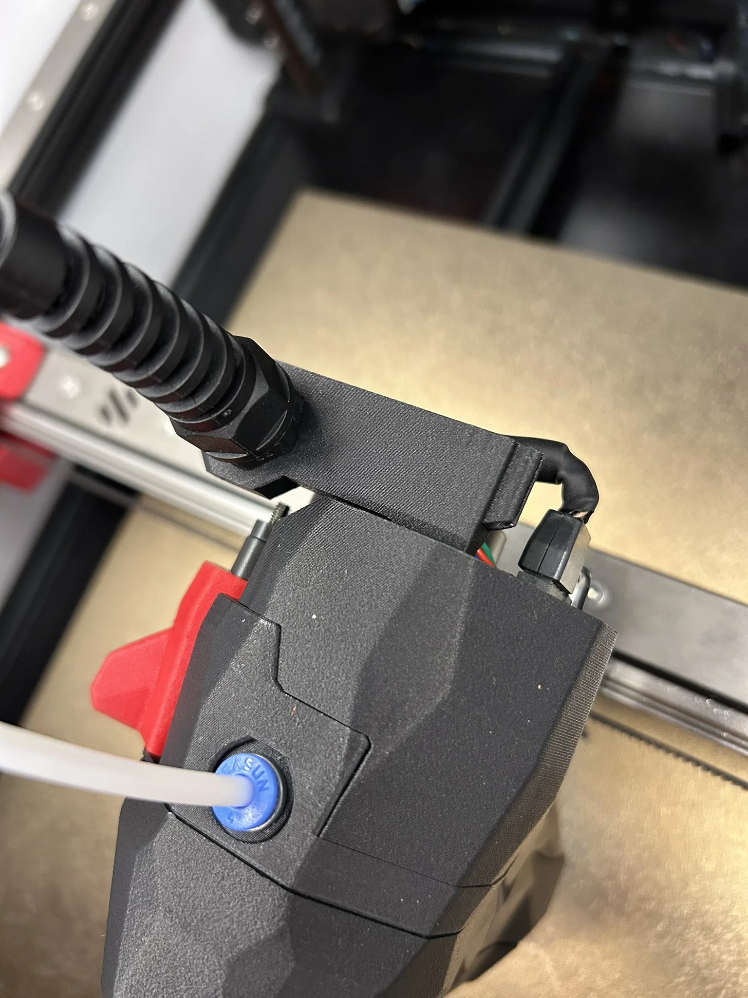 Thay thế cable chain bằng đầu siết cáp (PG7 gland) cho umbilical. Nhiều mount khác thường bị vướng với Z-cablechain. Mount này gắn cable gland ở bên hông motor extruder, chiếm rất ít phần kích thước Y vốn đã quý. Không cần tháo Z-chain. Độ chắc chắn tương đương mount gốc của JaredC01.