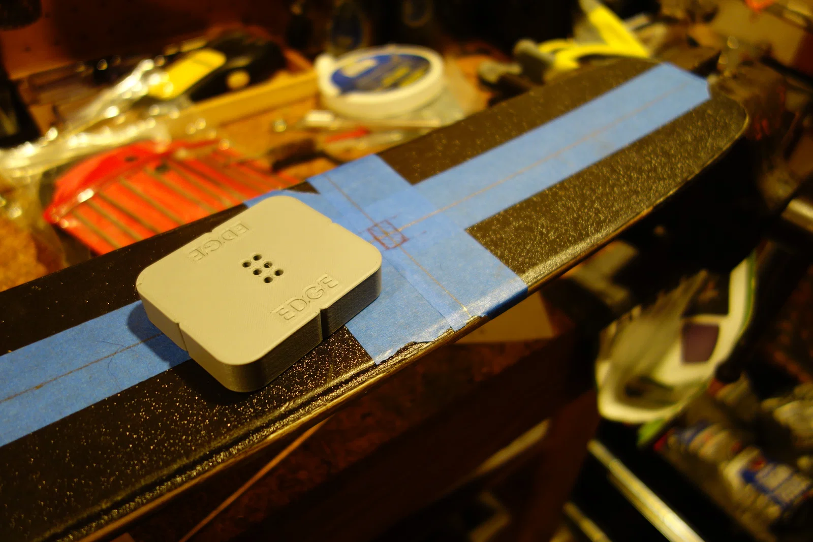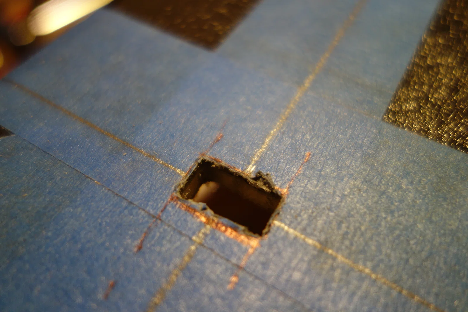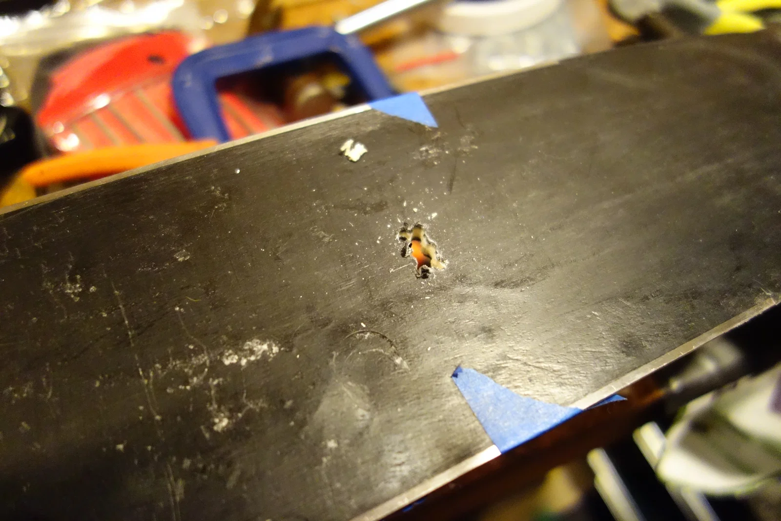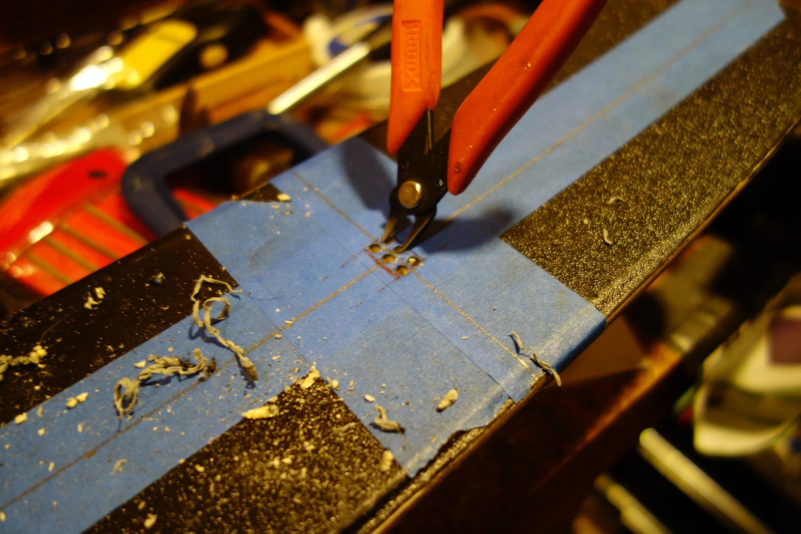 Cái drill jig này nên canh thẳng hàng ở vị trí cách đuôi 86cm (trên bản ván dài 184cm), khoan đủ 6 lỗ, cắt các phần bridge, giũa cho phẳng, trám kín bằng epoxy, xong xuôi.