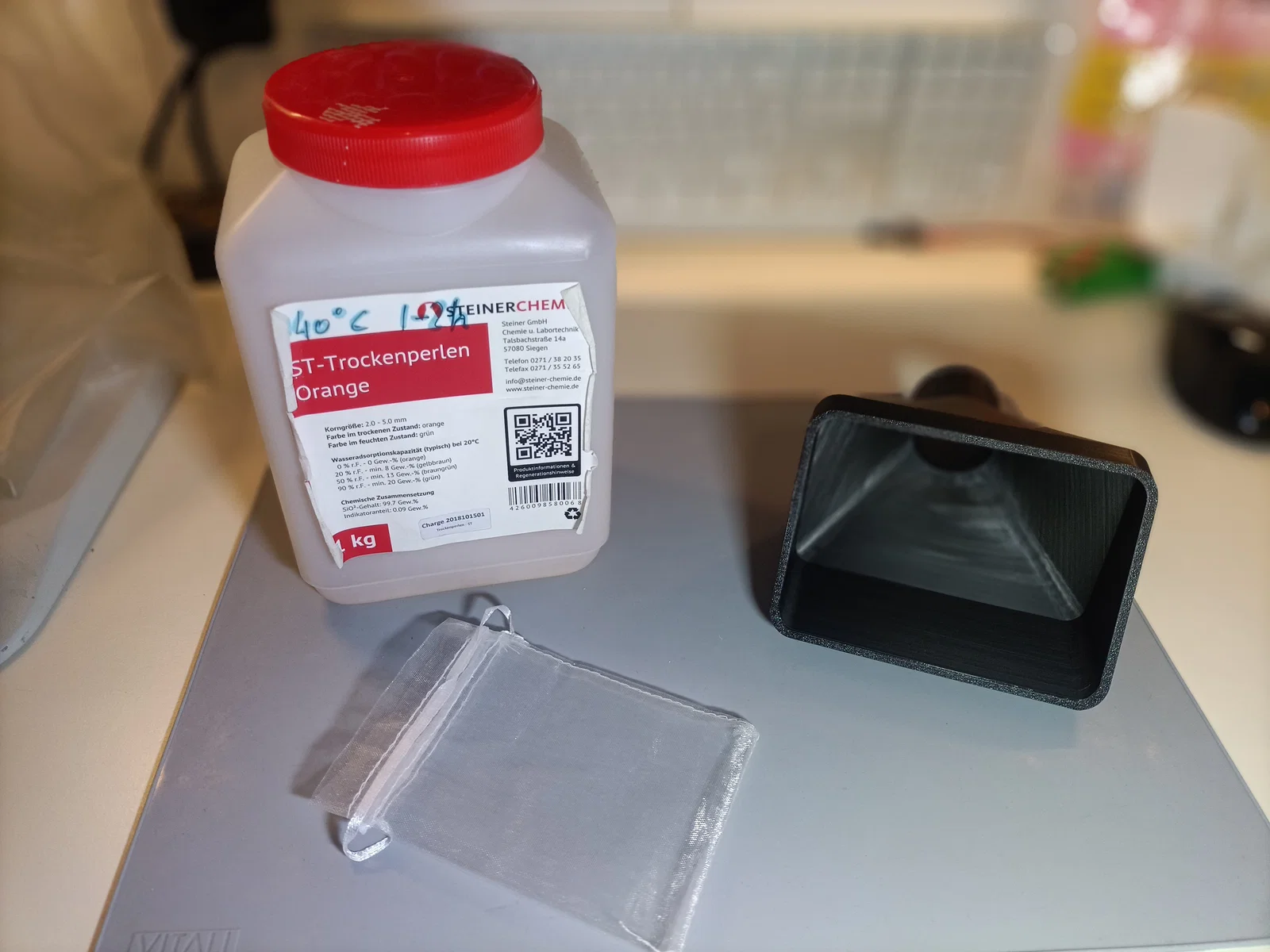 Mẫu phễu giúp đổ hạt hút ẩm (desiccant pearls) vào túi vải gạc (gauze bag) gọn gàng, hạn chế rơi vãi. In PLA dựng đứng, không cần supports; chỉ cần brim 2cm. Có kèm file fusion-f3d để tùy chỉnh.