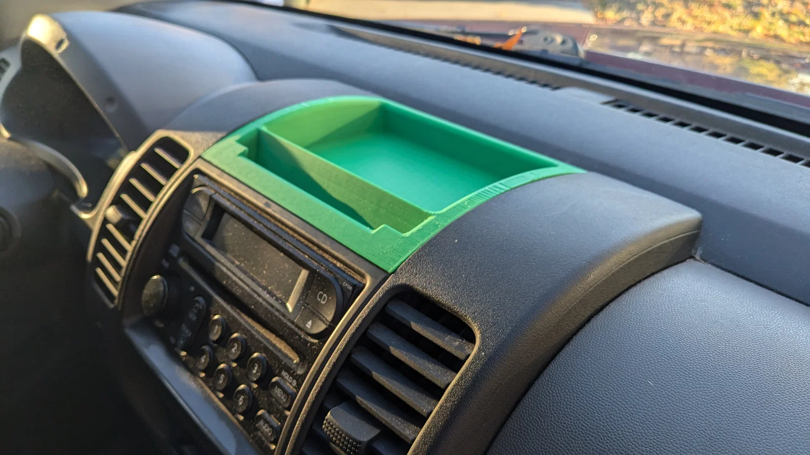 Mé trước của hộp chứa đồ có một rãnh để đặt điện thoại. Ở giữa rãnh có bo tròn (fillet) để nhìn được nhiều màn hình hơn khi đặt điện thoại nằm ngang. Nhờ vậy nhìn bản đồ dẫn đường dễ hơn và thao tác điện thoại cũng tiện hơn. Nếu đặt điện thoại theo chiều dọc, nên đẩy qua một bên của rãnh để được phần không bo tròn đỡ chắc hơn, tránh rớt điện thoại khi xe tăng tốc.