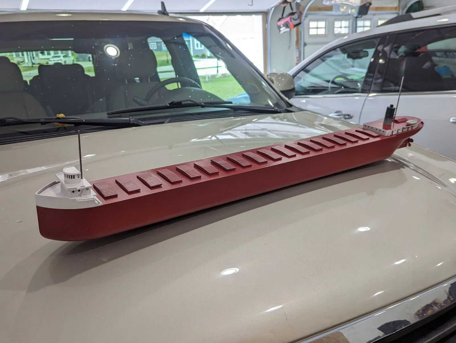 Ở giữa phần mũi và phần đuôi là sáu khoang hàng. Mỗi đầu (mũi và đuôi) đều có một vách ngăn (bulkhead), và toàn bộ khu vực khoang hàng là một khối rỗng dạng “bồn tắm” (hollow bathtub) y như tàu thật. Cabin điều khiển ở mũi (bow pilot house) và nhà boong ở đuôi (stern deck house) đều tháo rời được để lần lượt tiếp cận chỗ để pin và hệ điện tử. Dù cả con tàu có thể in chỉ hơn 1 cuộn filament một chút, mình đã tốn tới 3 cuộn, do có chỉnh thiết kế phần khoang hàng giữa để gia cường cho chắc hơn. Model hoàn thiện dài 1150mm (45-1/4”), tỉ lệ 1:160 (N-scale) và phải dằn thêm cát (ballast) vì nó nổi “quá tốt”.