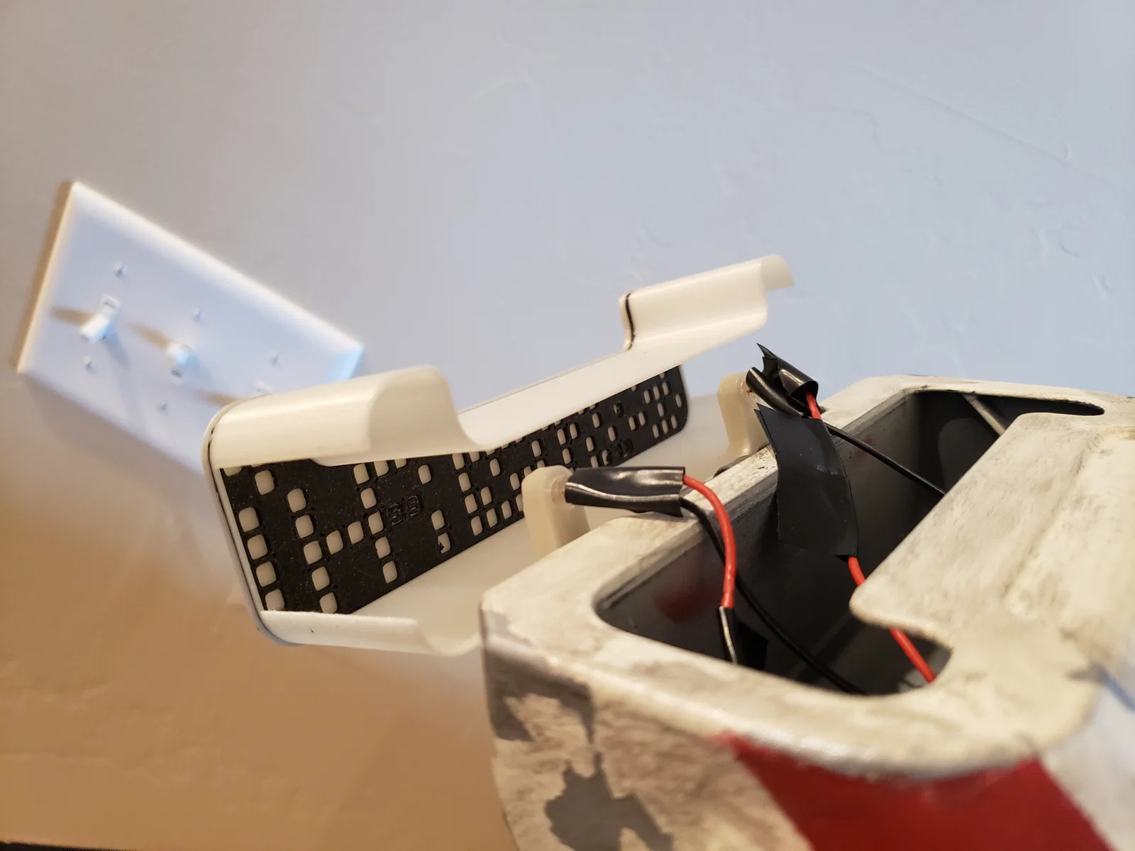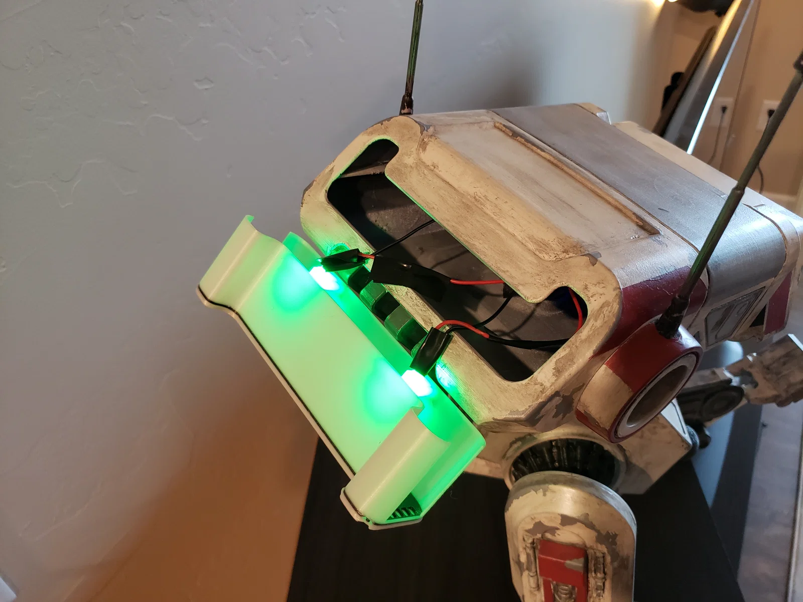 Mình muốn con BD-1 của mình sáng lên mà khỏi phải lăn tăn chuyện rườm rà và tốn kém khi dùng một LED matrix “xịn” thật. Vì vậy mình làm cái light plate và projection mount này để dùng với LED 5mm tiêu chuẩn, giúp ánh sáng được tán đều và chiếu ra phía tấm back plate. Mình đi dây chung với vài LED khác và dùng pin 9V.