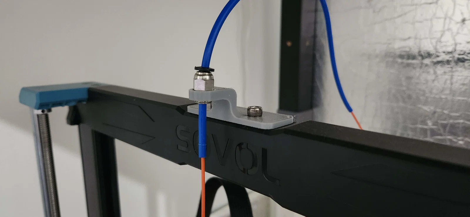 Thiết kế dẫn filament gắn trên cho Sovol SV06+, giúp cuộn filament đặt lùi phía sau và cấp từ trên xuống. Lắp vừa vị trí ren sẵn, dùng lại bu-lông, cần PC4-M10 và ống PTFE. Khuyến nghị in PETG ~1 giờ.