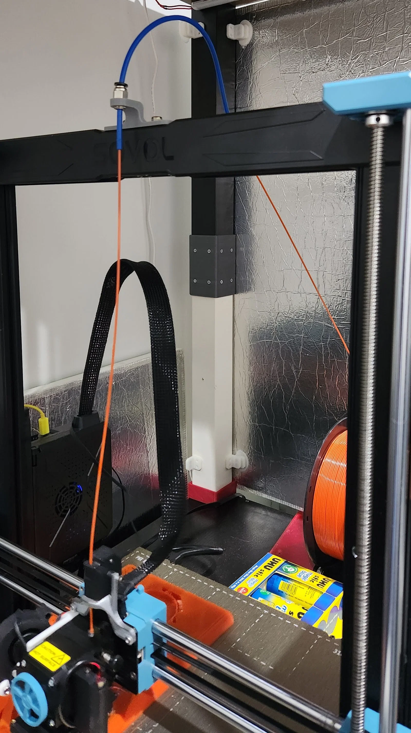 Mình thiết kế cái này (dùng model SV06+ từ Sovol) để cuộn filament nằm lùi ra phía sau máy một CHÚT xíu và cho filament đi từ phía trên xuống. Kế hoạch cuối là để cuộn filament trên mặt bàn, rồi cho đi qua một cái lỗ khoan thẳng xuống và chui vô đúng cái guide này. Lắp vừa khít vào đúng vị trí phần ren hiện tại, dùng lại y chang bu-lông cũ, kèm một đầu nối PC4-M10 và ống PTFE tiêu chuẩn.