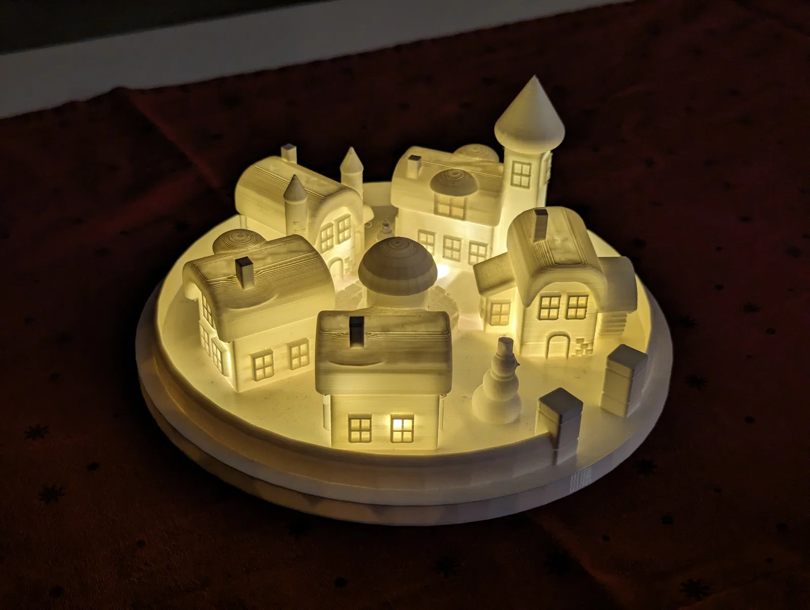 Mô hình làng Giáng Sinh nhỏ xinh kiểu elf town, có chiếu sáng LED. In layer 0.2mm không cần supports; chỉ dùng infill cho phần đế. Khi slice, dùng generic box hoặc battery compartment.stl làm negative volume.