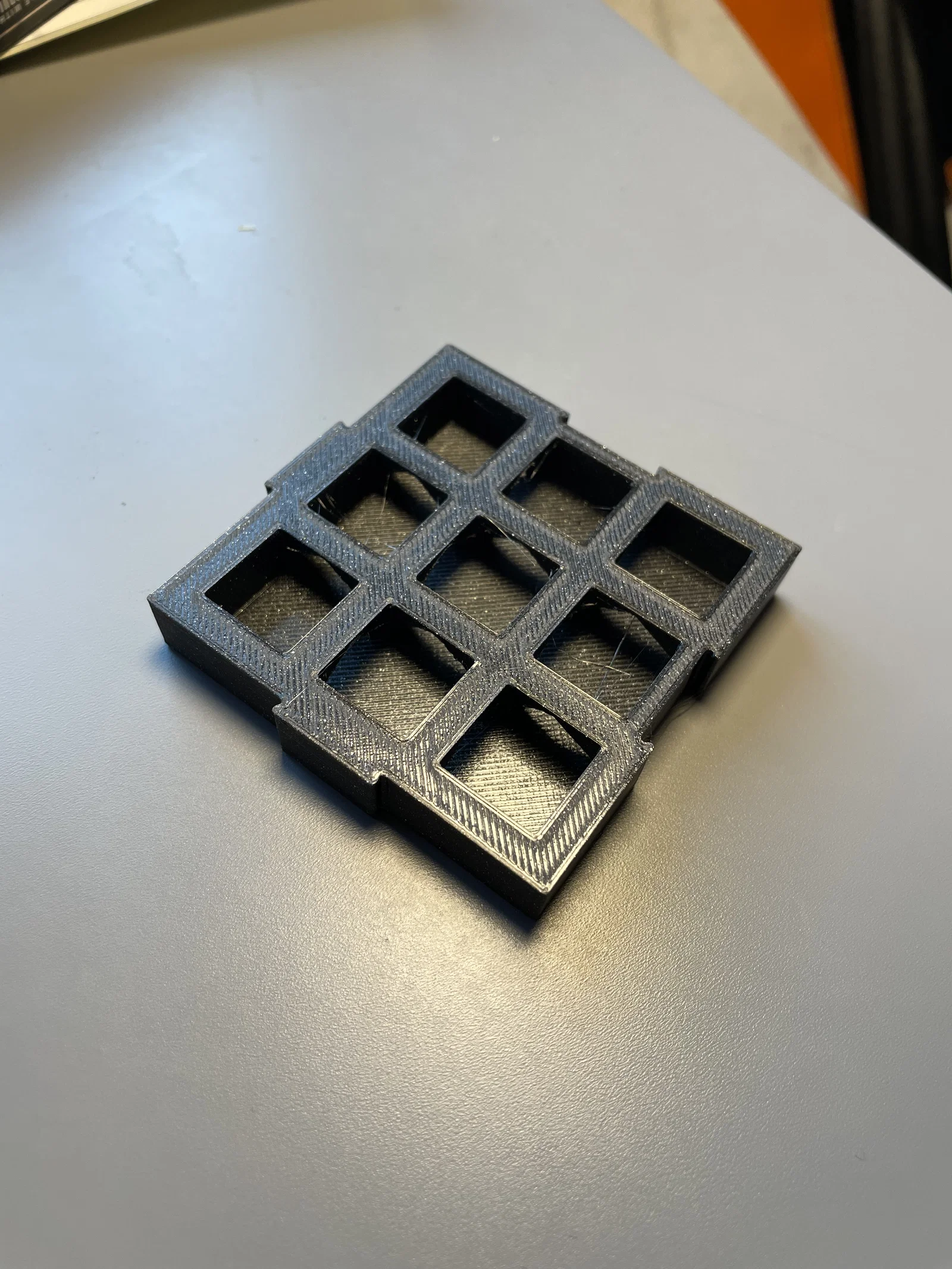 Switch tester 3x3 có cạnh bên kín như case bàn phím thật, giúp hạn chế việc âm thanh switch bị khác do hở cạnh. Có cơ chế slide-in để mở rộng, nối thêm module khi sưu tầm thêm switch; in tốt với PETG và infill ≥15%.