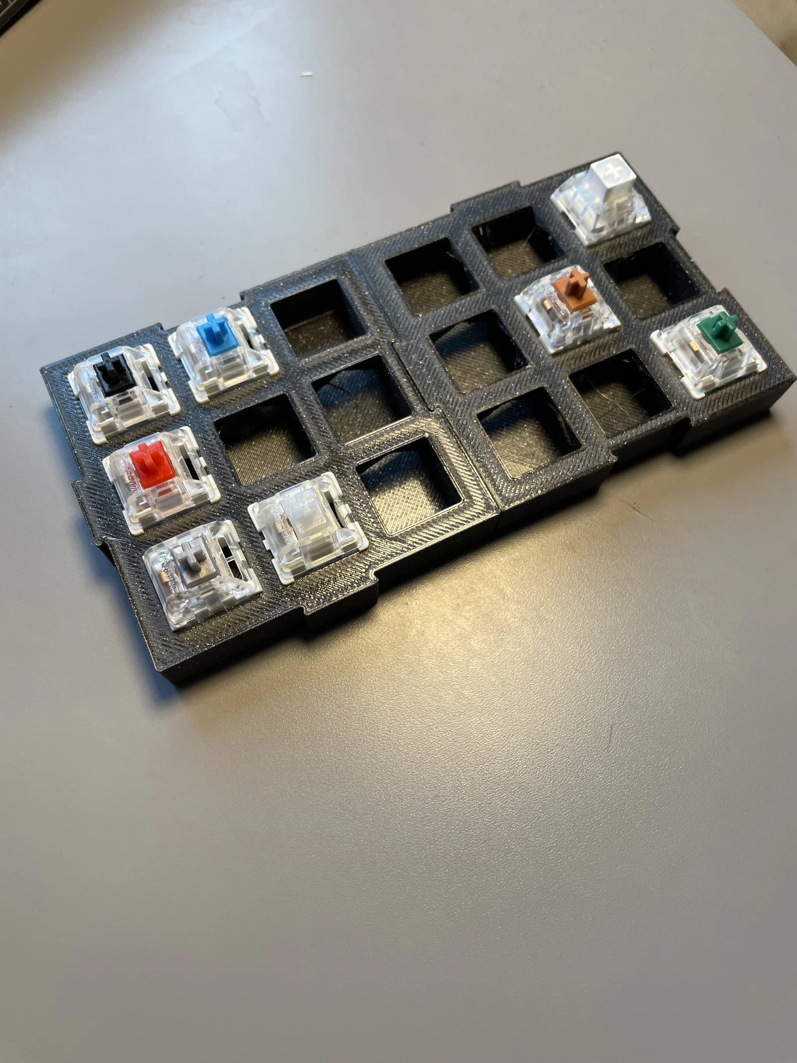 Ý tưởng của cái switch tester này là làm loại có các cạnh bên được che kín, vì trên bàn phím bình thường thì đa số các mặt bên của case đều kín. Mấy switch tester mình thấy online thường để hở cạnh, mà chuyện đó có thể làm thay đổi âm thanh của switch, nên mình muốn in một cái có cạnh kín. Mình cũng muốn có thể mở rộng bộ sưu tập dễ dàng mà vẫn để chung một chỗ, nên mình thêm cơ chế trượt (slide-in) đơn giản để có thể nối thêm board khi bộ sưu tập tăng lên.