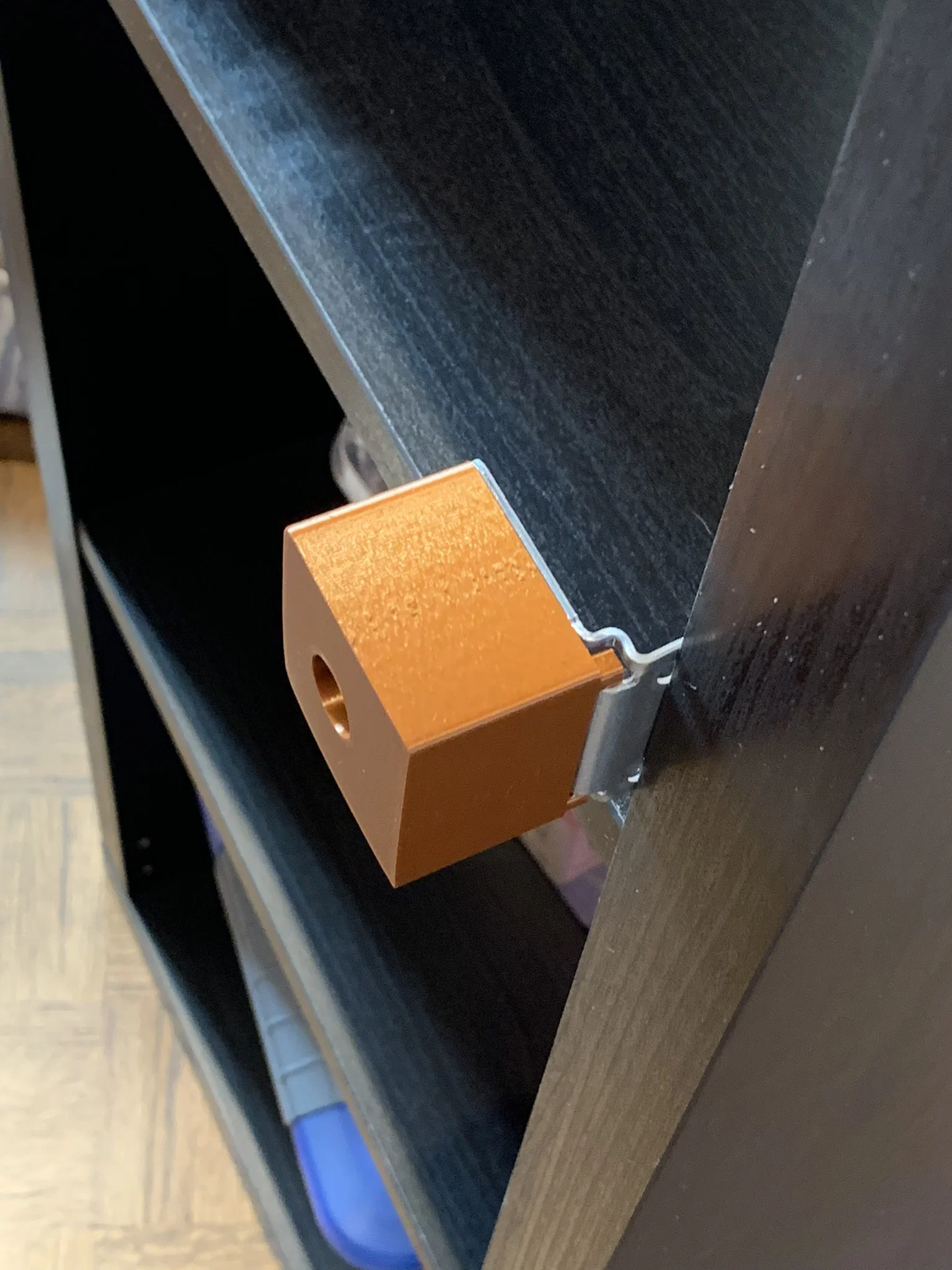Pát Kallax cơ bản (phụ tùng Ikea #115753) có hai vị trí để “né” len chân tường sâu tối đa khoảng 10 mm. Miếng standoff này sẽ tạo thêm khoảng cách ra khỏi tường.