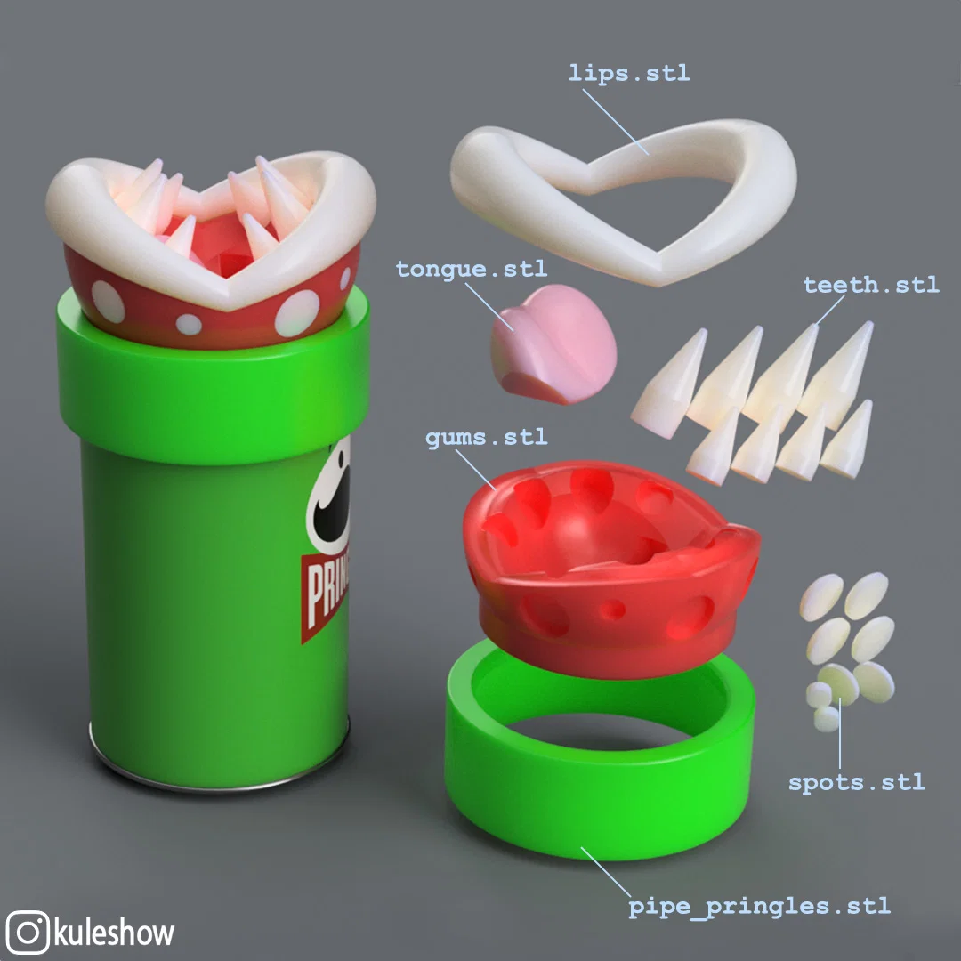 Nắp heo đất Piranha Plant lấy cảm hứng Mario. Thiết kế đường kính 80mm, ren 6 lead-in, khe thả xu dài 42mm nên hầu như đồng nào cũng lọt. Có bản cập nhật thêm ống cho wide mouth mason jar và Pringles.