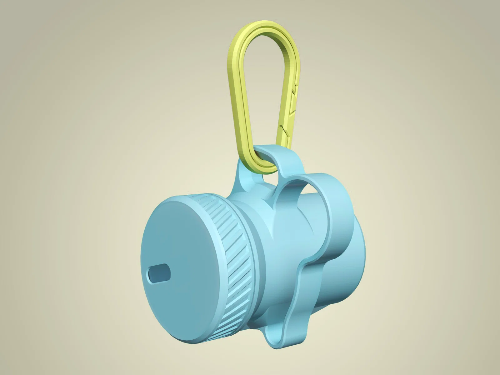 Hộp đựng túi phân chó gắn carabiner/split ring, thiết kế nhỏ gọn nhẹ (34g). Bên trong chứa cuộn túi sạch, bên ngoài có móc vòng treo túi đã dùng. Nắp tương thích các phiên bản thân.